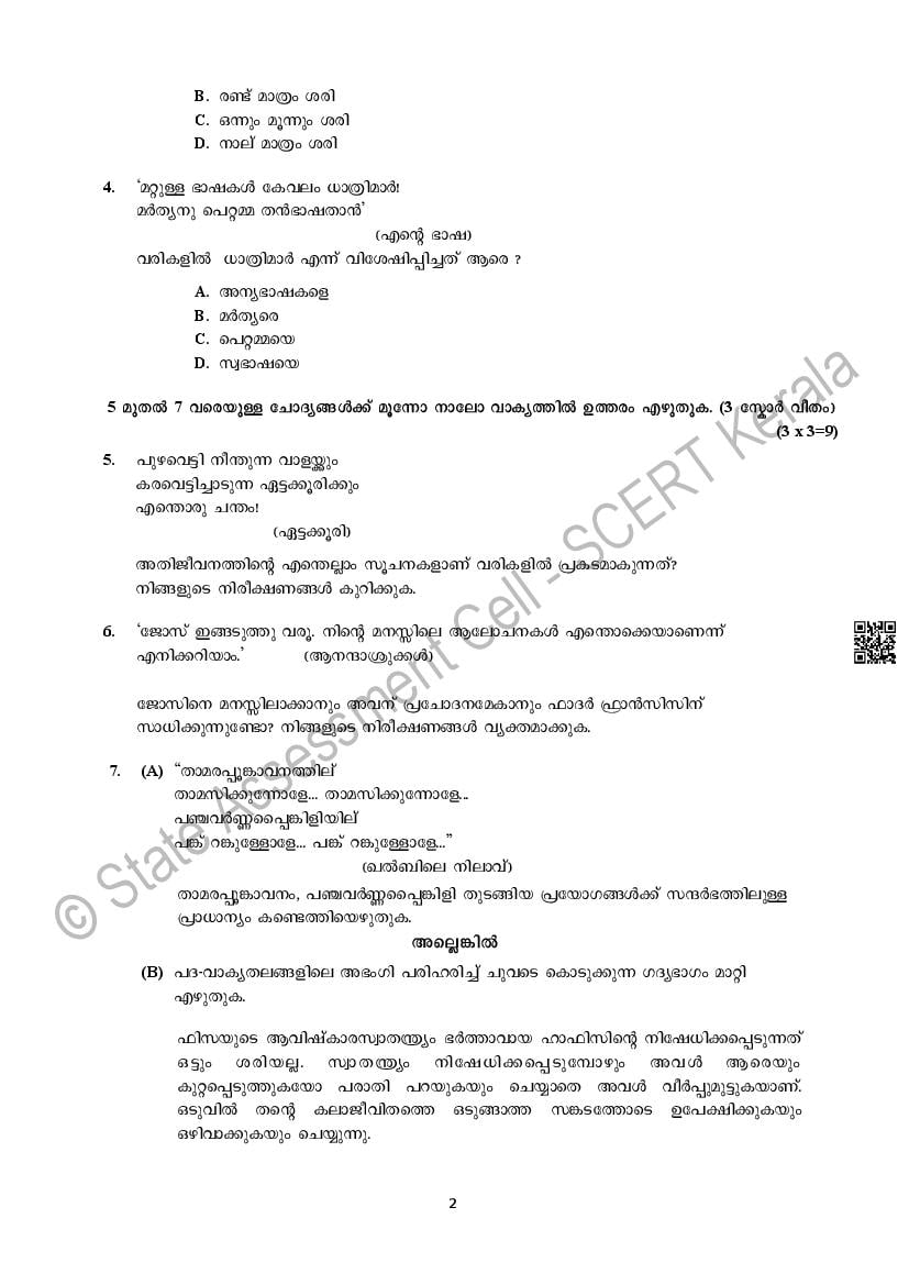 The Kerala Board Model Question Paper for class 10 SSLC Malayalam is as follows.