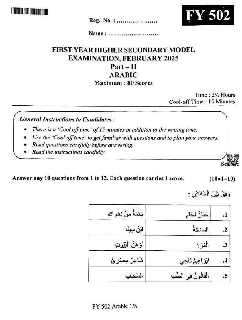 The Kerala Board Plus One Model Exam 2026 Question Paper of Arabic is as follows. This can also be used as a Kerala Sample Question Paper for Plus One class 11, for the Arabic subject test.