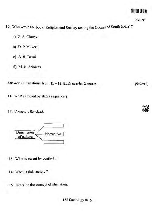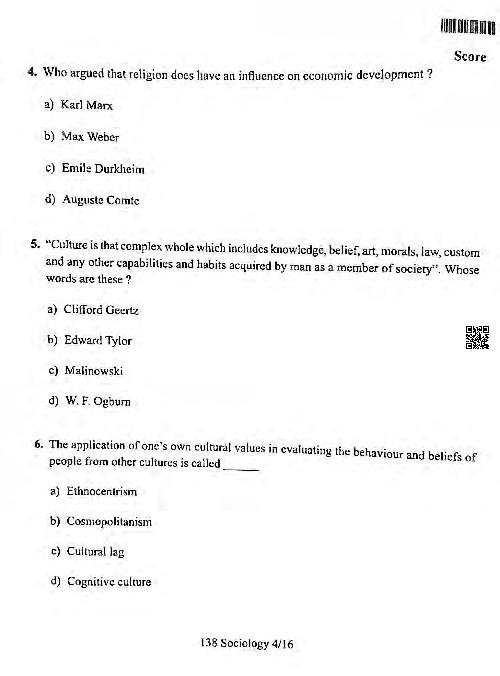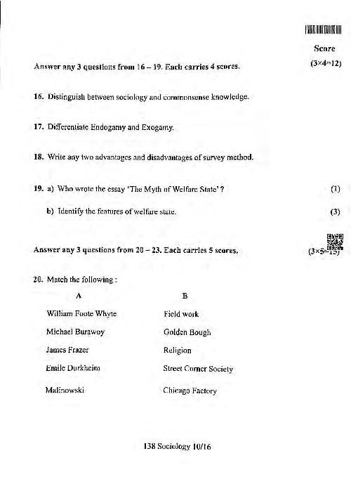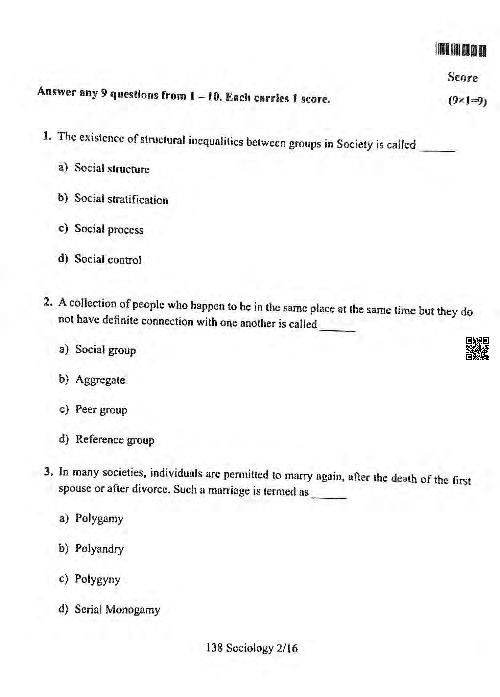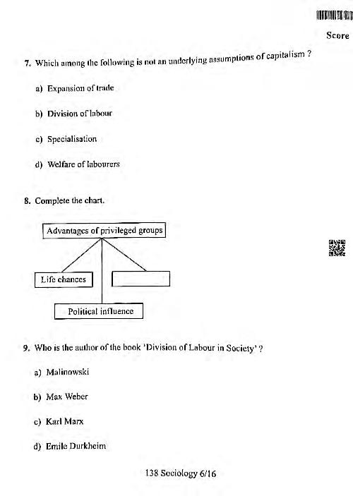 The Kerala Board Plus One Model Exam 2025 Question Paper of Sociology is as follows. This can also be used as a Kerala Sample Question Paper for Plus One class 11, for the Sociology subject test.
