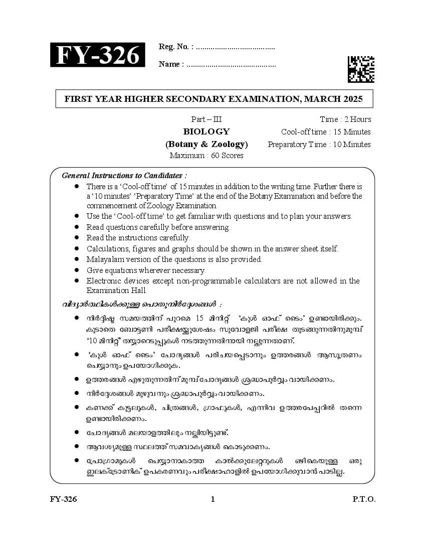 Kerala Plus One Biology Question Paper 2025 Download Link – Click Here to Download Question Paper PDF