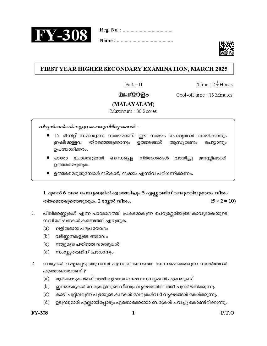 Kerala Plus One Question Paper 2025 Malayalam View Download