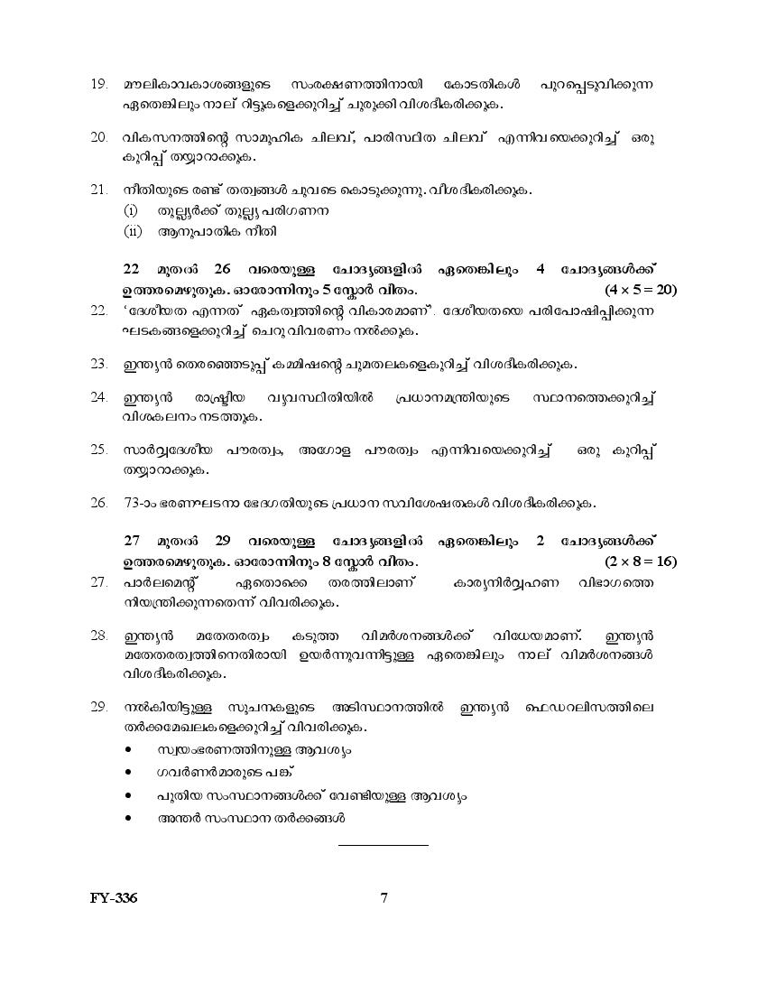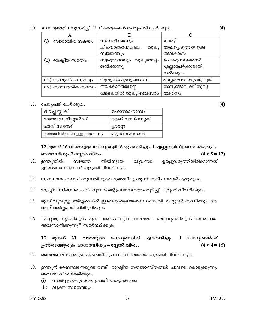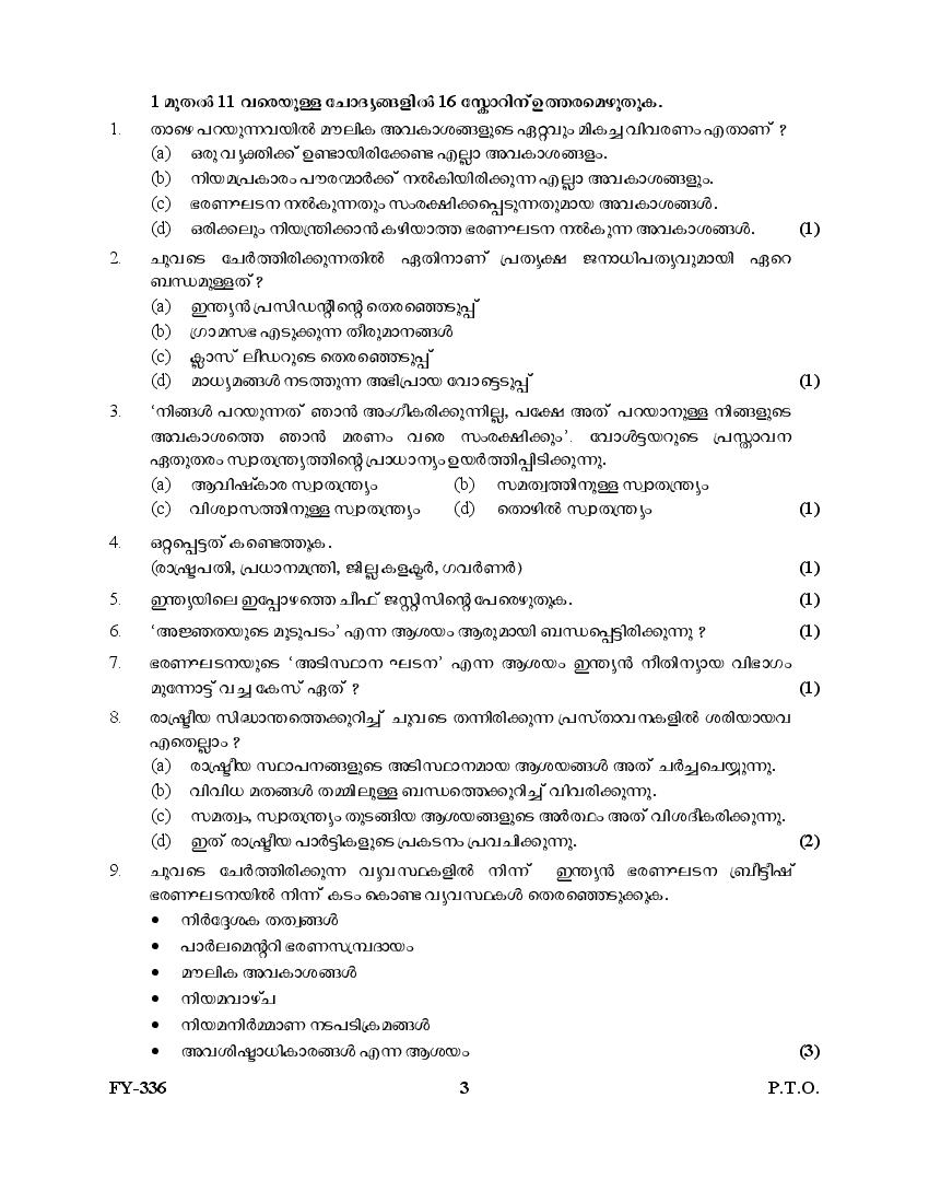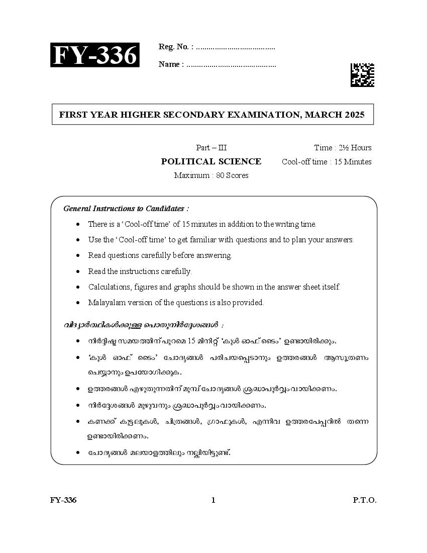 Kerala Plus One Question Paper 2025 Political Science View Download