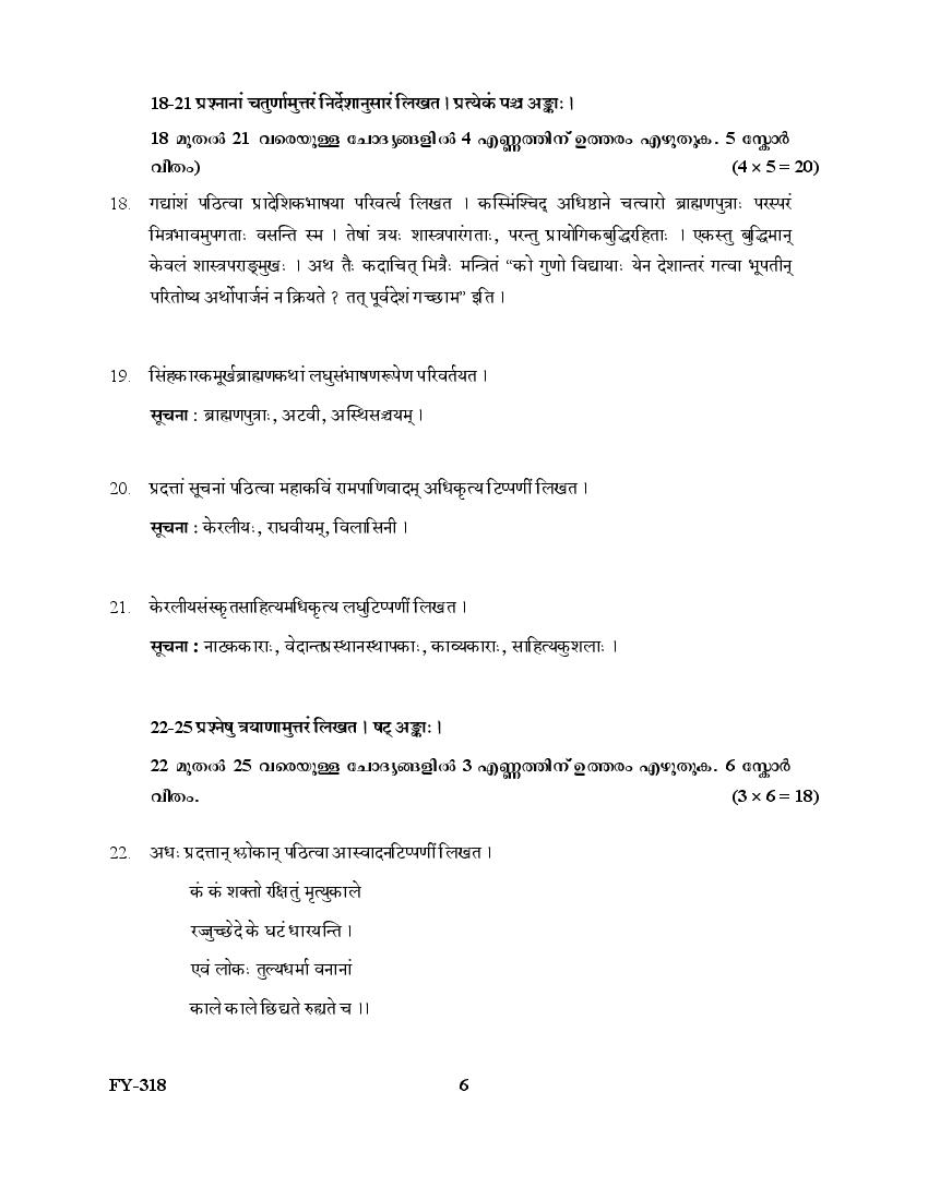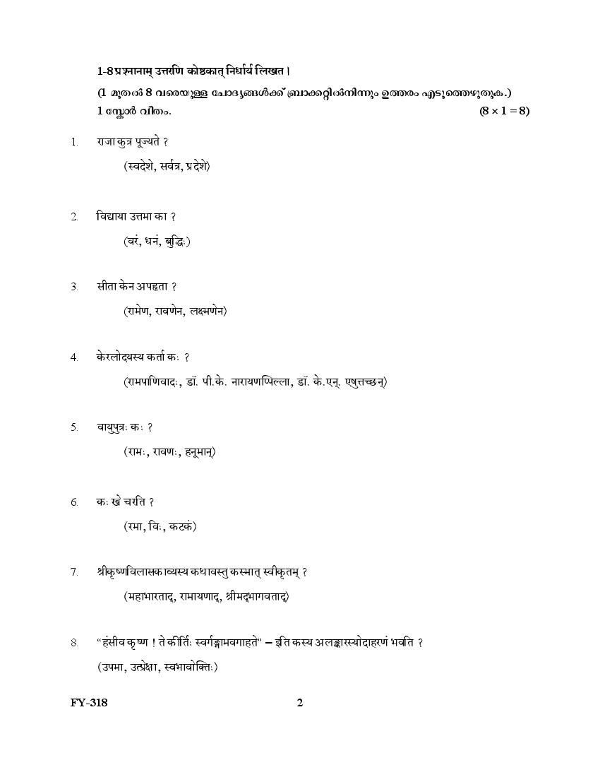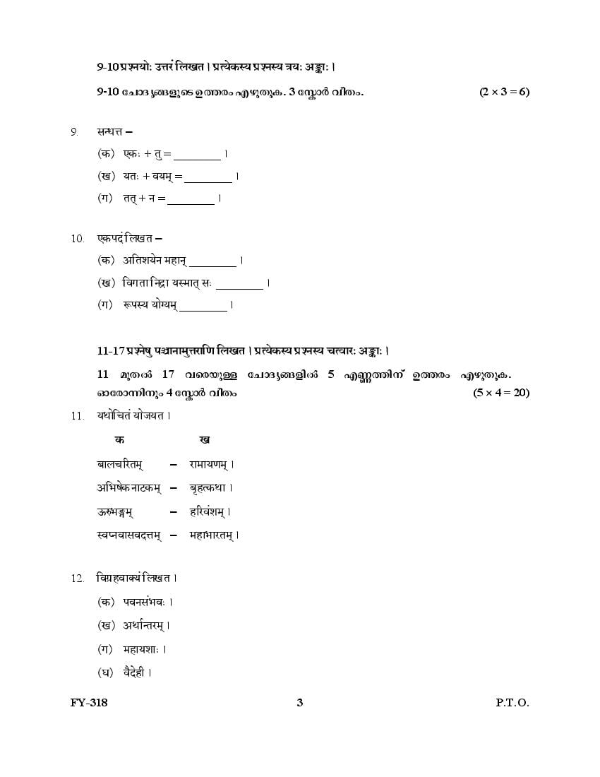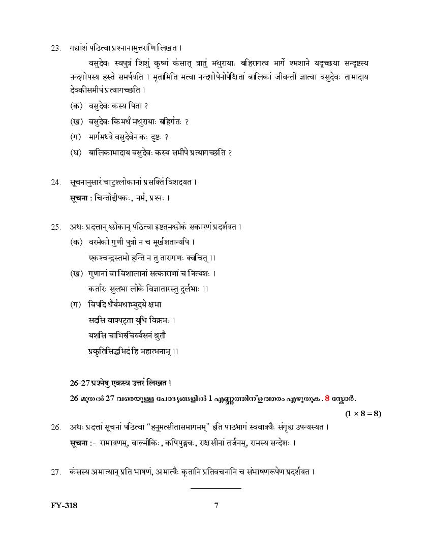 The Kerala Previous Year Question Paper for Class 11 (Plus One) Sanskrit Sahitya is as follows.