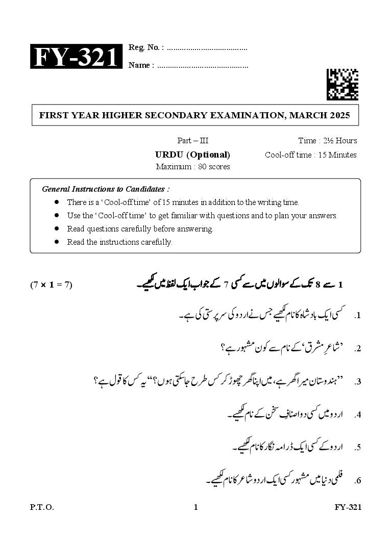 Kerala Plus One Question Paper 2025 Urdu Optional View Download