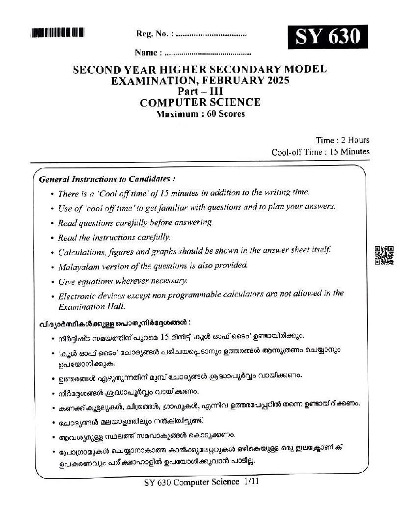 The Kerala Board Plus Two Model Exam 2026 Question Paper of Computer Science is as follows. This can also be used as a Kerala Sample Question Paper for Plus Two class 12, for the Computer Science subject test.