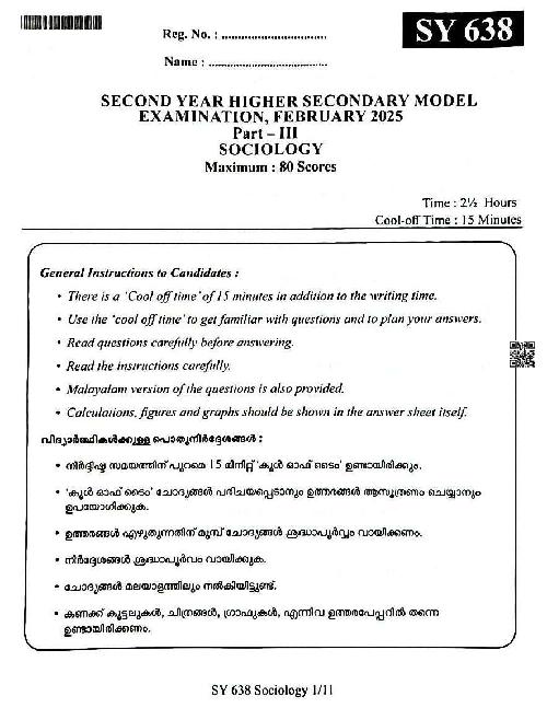 Kerala Plus Two Model Exam Question Paper 2025 Sociology View Download
