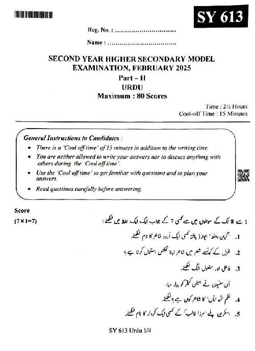 The Kerala Board Plus Two Model Exam 2026 Question Paper of Urdu is as follows. This can also be used as a Kerala Sample Question Paper for Plus Two class 12, for the Urdu subject test.