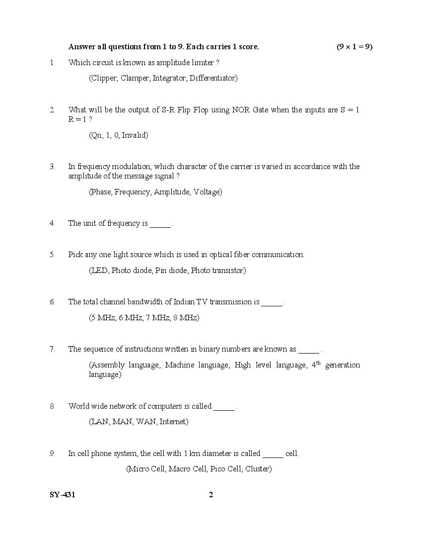 The Kerala Previous Year Question Paper for Class 12 (Plus Two) Electronics is as follows.