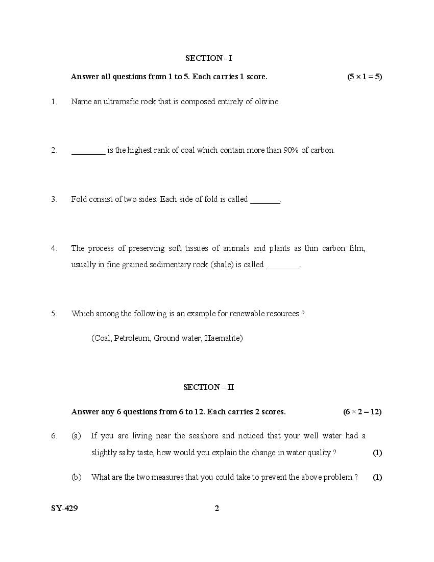 The Kerala Previous Year Question Paper for Class 12 (Plus Two) Geology is as follows.