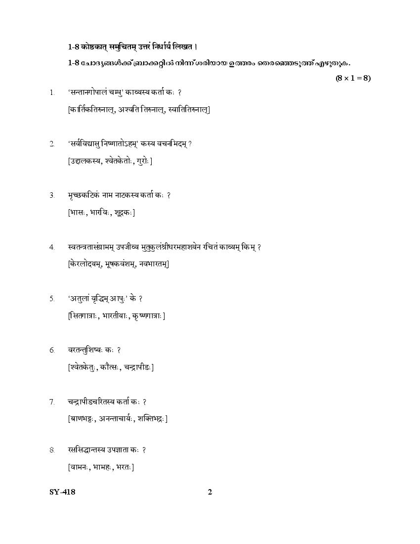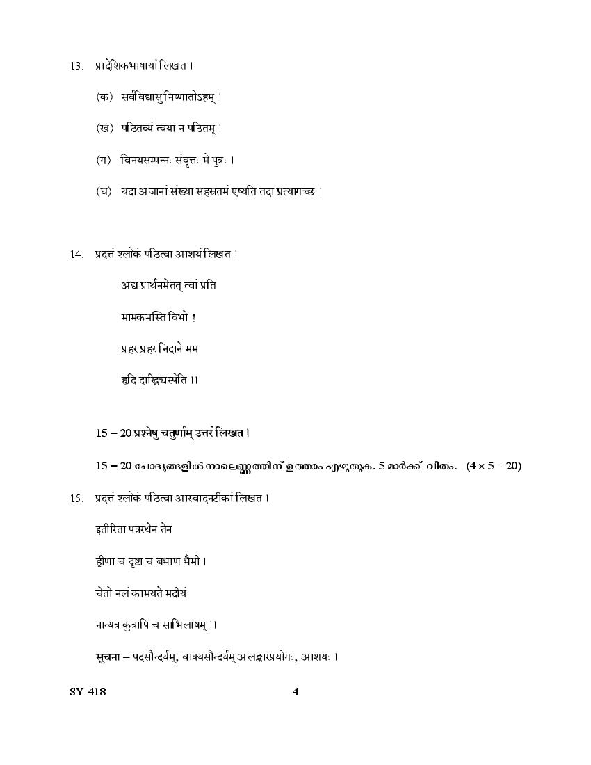 The Kerala Previous Year Question Paper for Class 12 (Plus Two) Sanskrit Sahitya is as follows.