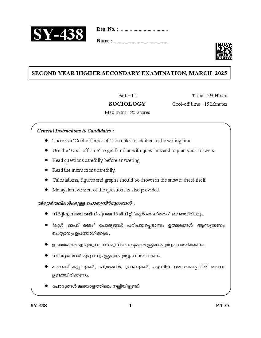 | Education Material Here | Kerala Board Exam Question Paper for Class 12 Sociology 2025 |