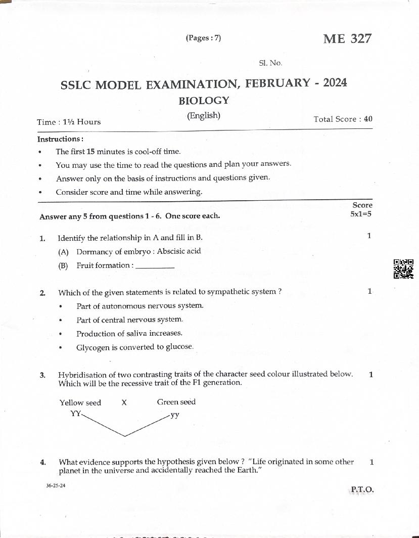 The Kerala Board SSLC Model Exam 2025 Question Paper of Biology is as follows. This can also be used as a Kerala Sample Question Paper for SSLC class 10, for the Biology subject test.