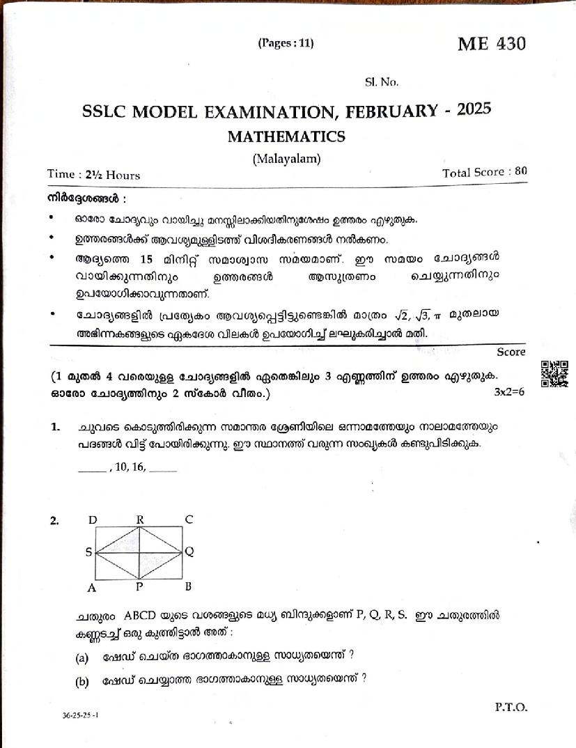 Kerala SSLC Maths Model Exam Question Paper 2025 Download Link – Click Here to Download Question Paper PDF
