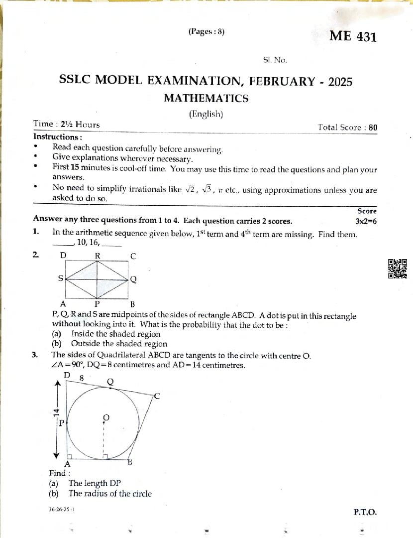 The Kerala Board SSLC Model Exam 2026 Question Paper of Maths is as follows. This can also be used as a Kerala Sample Question Paper for SSLC class 10, for the Maths subject test.