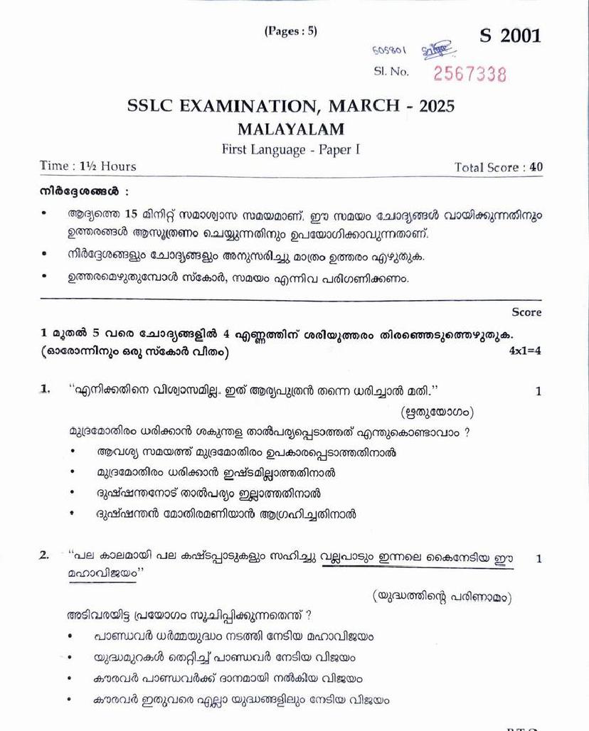 Kerala Class SSLC Question Paper 2025 Malayalam Paper I View Download