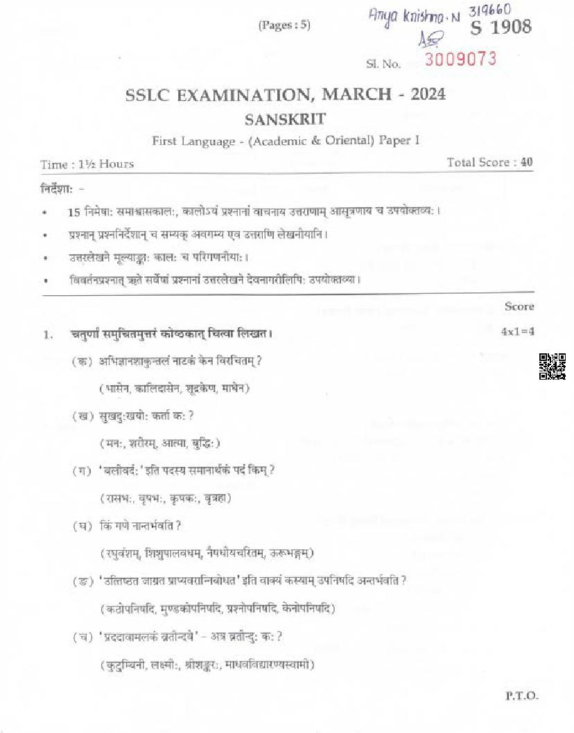 Kerala SSLC 2024 Question Paper Sanskrit View Download