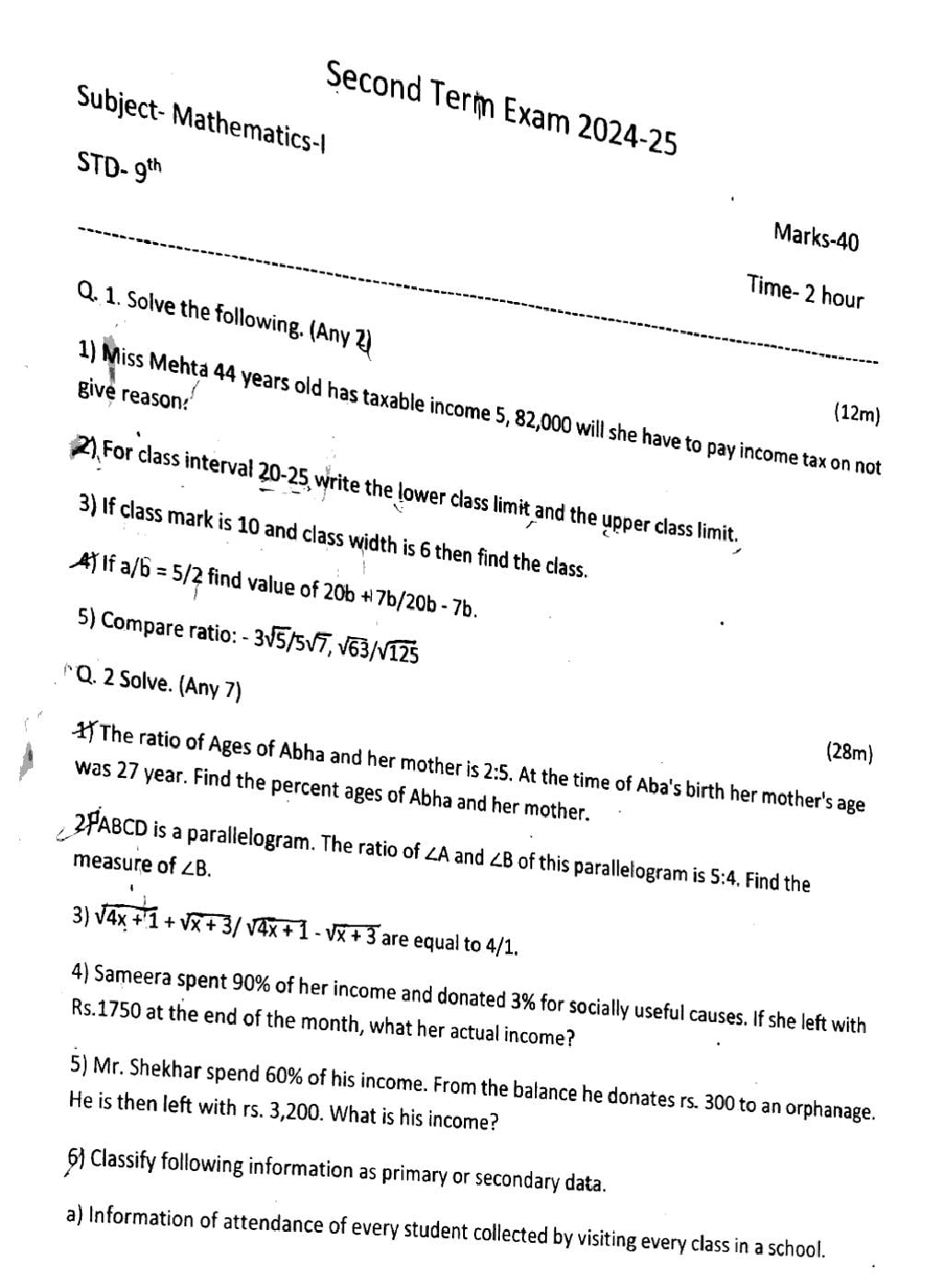 Maharashtra Class 9 Question Paper 2025 Mathematics (Second Term) View Download
