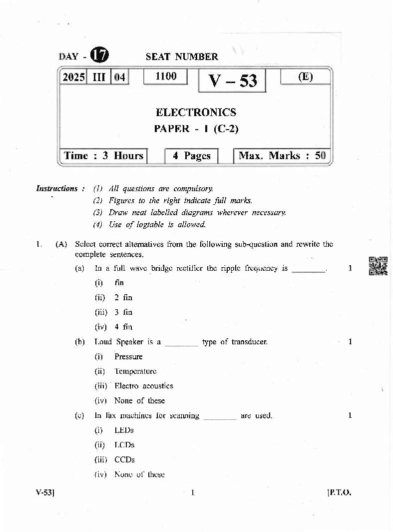MH 12th Question Paper 2025 Electronics Paper-1 View Download
