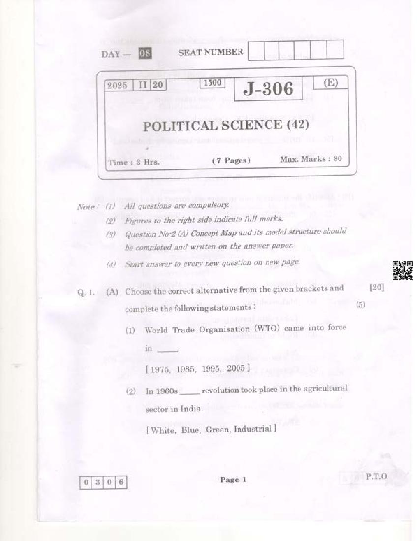 Maharashtra HSC Political Science Question Paper 2025 PDF