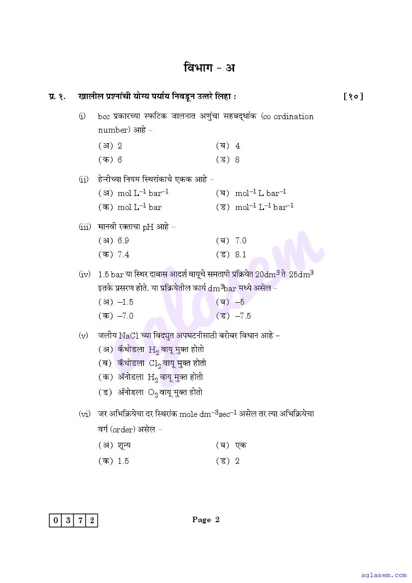 The Maharashtra Board Model Sample Paper for class 12 Chemistry is as follows.
