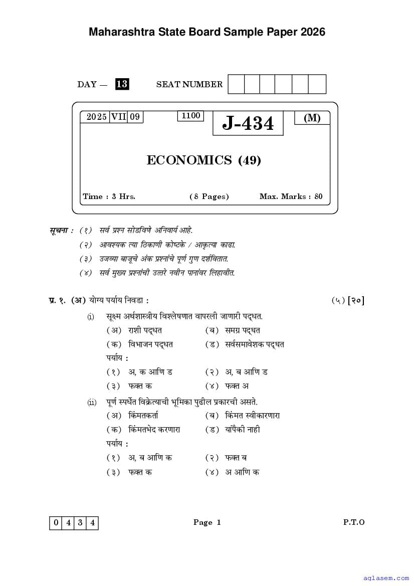 Maharashtra Board HSC Economics Sample Paper 2026 is an important study material. You can download the Maha Std 12 Economics Model Question Paper PDF here on aglasem to improve your learnings. This Class 12 Sample Paper of Maharashtra Board contains specimen questions of Economics subject from MSBSHSE syllabus. They help you practice what you learnt from HSC Economics textbook and also do well in tests and assessments.