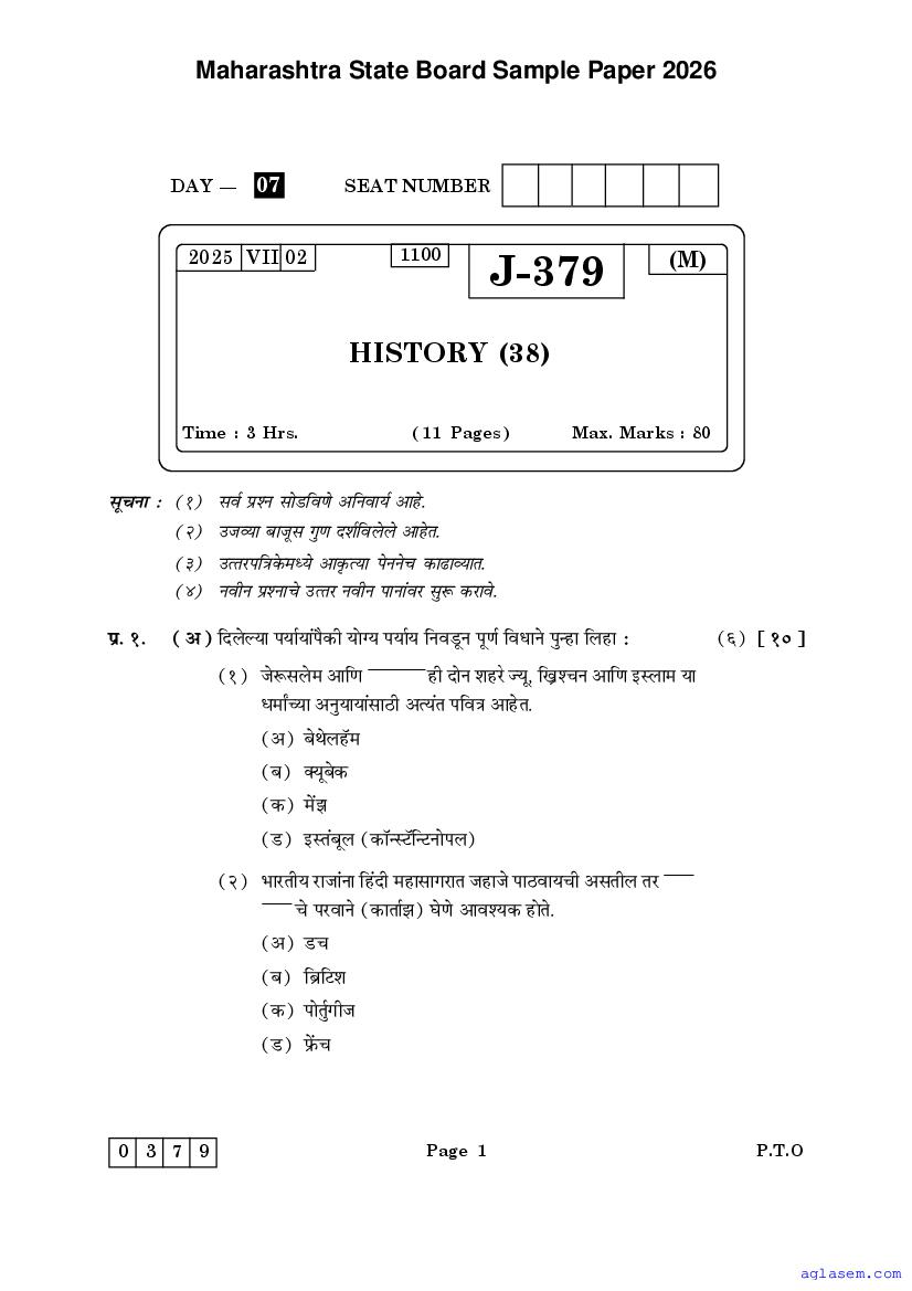 Maharashtra Board HSC History Sample Paper 2026 is an important study material. You can download the Maha Std 12 History Model Question Paper PDF here on aglasem to improve your learnings. This Class 12 Sample Paper of Maharashtra Board contains specimen questions of History subject from MSBSHSE syllabus. They help you practice what you learnt from HSC History textbook and also do well in tests and assessments.