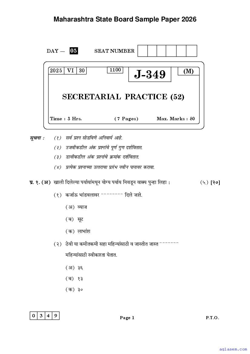 Maharashtra Board HSC Secretarial Practice Sample Paper 2026 is an important study material. You can download the Maha Std 12 Secretarial Practice Model Question Paper PDF here on aglasem to improve your learnings. This Class 12 Sample Paper of Maharashtra Board contains specimen questions of Secretarial Practice subject from MSBSHSE syllabus. They help you practice what you learnt from HSC Secretarial Practice textbook and also do well in tests and assessments.