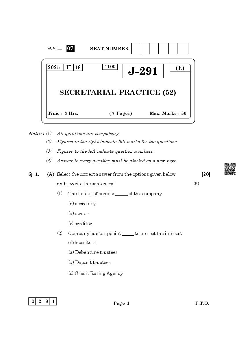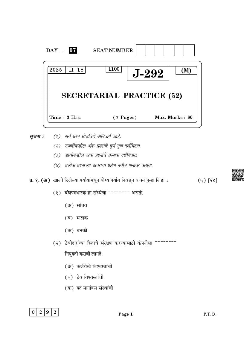 Maharashtra HSC Secretarial Practice Question Paper 2025 Download Link – Click Here to Download Question Paper PDF