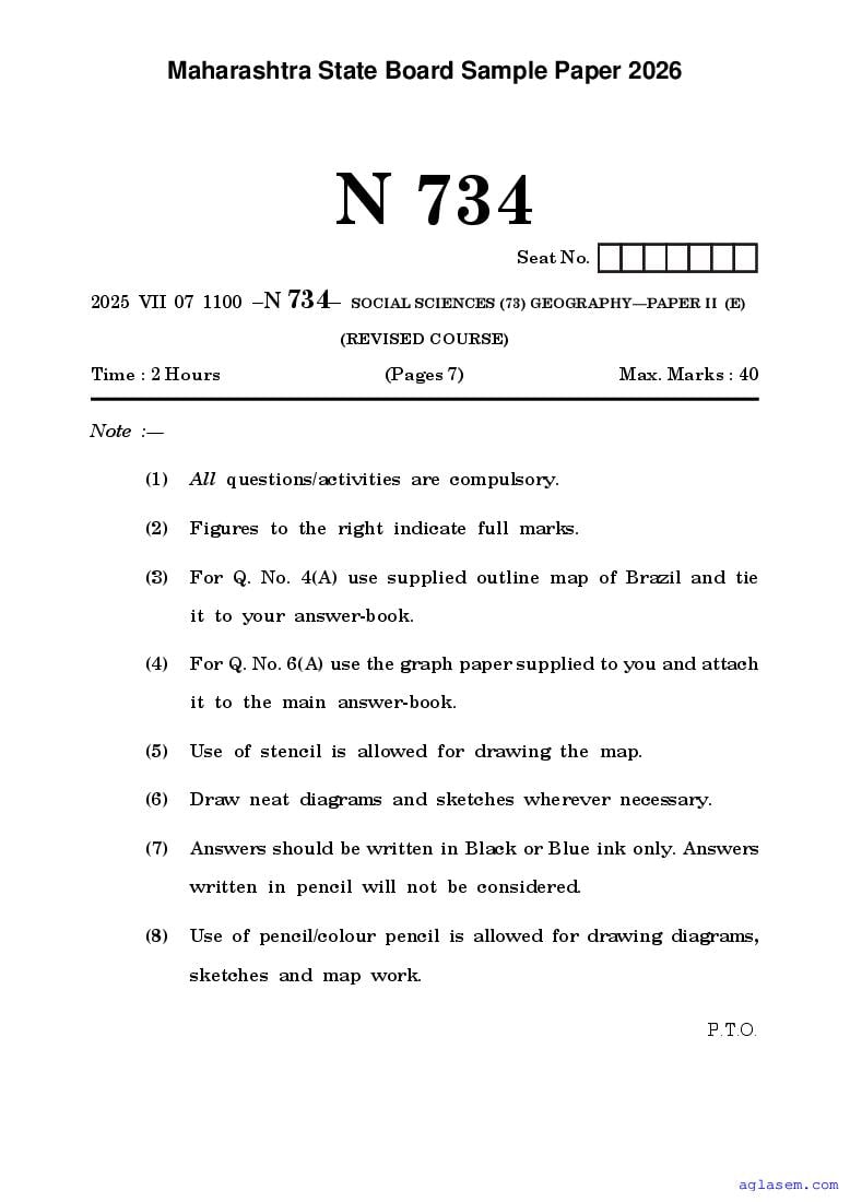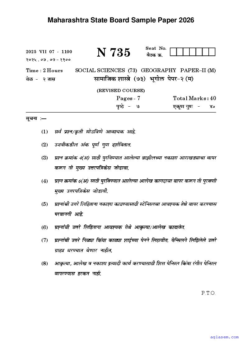 Maharashtra Board SSC Geography Sample Paper 2026 is an important study material. You can download the Maha Std 10 Geography Model Question Paper PDF here on aglasem to improve your learnings. This Class 10 Sample Paper of Maharashtra Board contains specimen questions of Geography subject from MSBSHSE syllabus. They help you practice what you learnt from SSC Geography textbook and also do well in tests and assessments.
