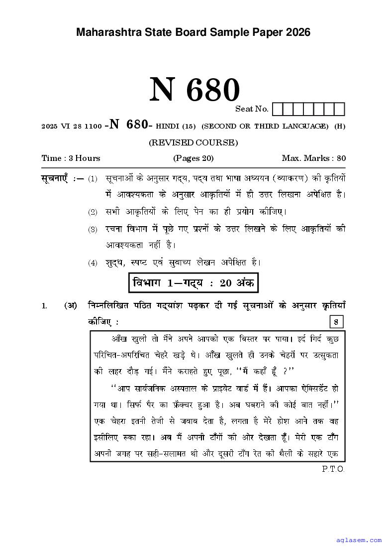 Maharashtra Board SSC Hindi Third Language Sample Paper 2026 is an important study material. You can download the Maha Std 10 Hindi Third Language Model Question Paper PDF here on aglasem to improve your learnings. This Class 10 Sample Paper of Maharashtra Board contains specimen questions of Hindi Third Language subject from MSBSHSE syllabus. They help you practice what you learnt from SSC Hindi Third Language textbook and also do well in tests and assessments.