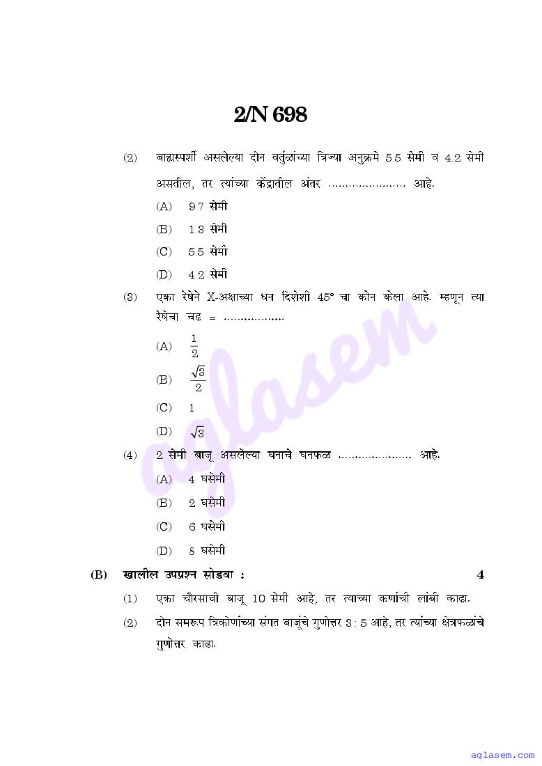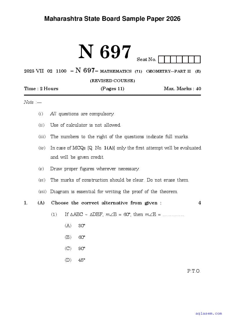 Maharashtra Board SSC Maths – Geometry Sample Paper 2026 is an important study material. You can download the Maha Std 10 Maths – Geometry Model Question Paper PDF here on aglasem to improve your learnings. This Class 10 Sample Paper of Maharashtra Board contains specimen questions of Maths – Geometry subject from MSBSHSE syllabus. They help you practice what you learnt from SSC Maths – Geometry textbook and also do well in tests and assessments.