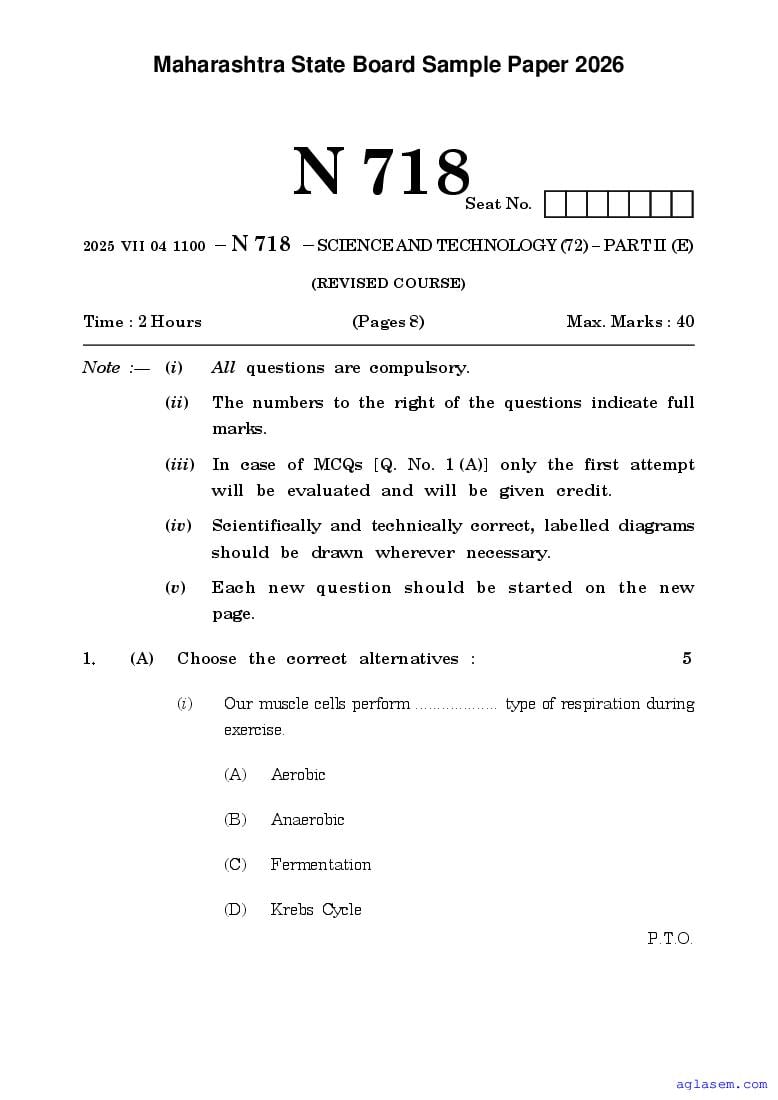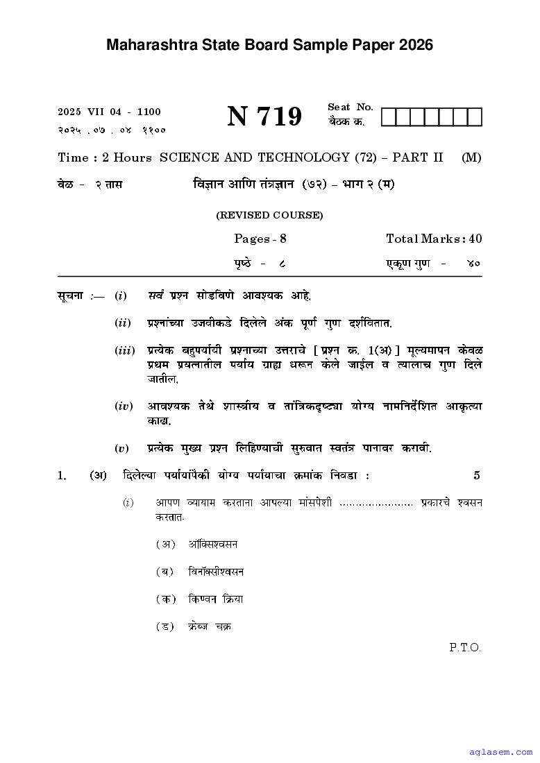 Maharashtra Board SSC Science and Technology II Sample Paper 2026 is an important study material. You can download the Maha Std 10 Science and Technology II Model Question Paper PDF here on aglasem to improve your learnings. This Class 10 Sample Paper of Maharashtra Board contains specimen questions of Science and Technology II subject from MSBSHSE syllabus. They help you practice what you learnt from SSC Science and Technology II textbook and also do well in tests and assessments.