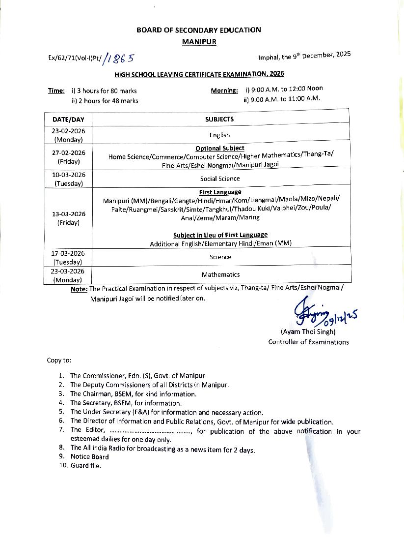Latest: – Manipur HSLC Time Table 2026 has been released. Scroll down to check the complete time table.