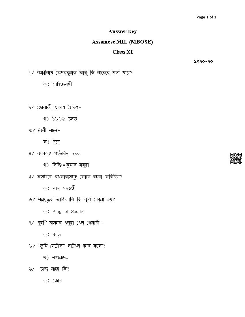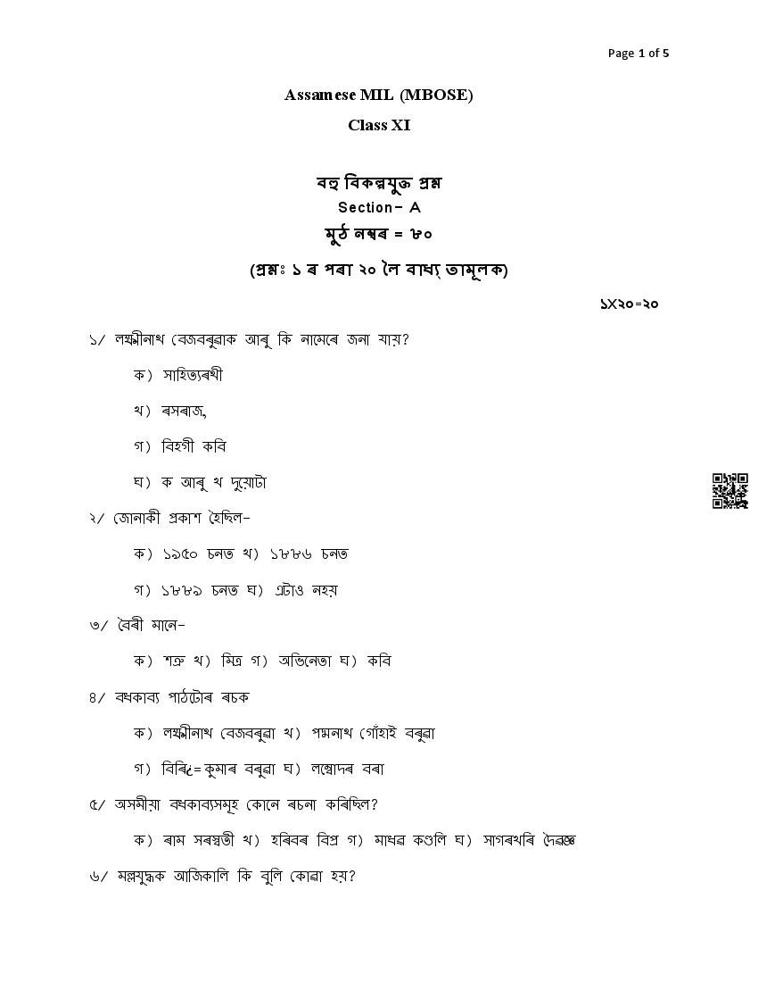 The MBOSE Sample Question Paper 2026 for Class XI (Class 11) Assamese is as follows.