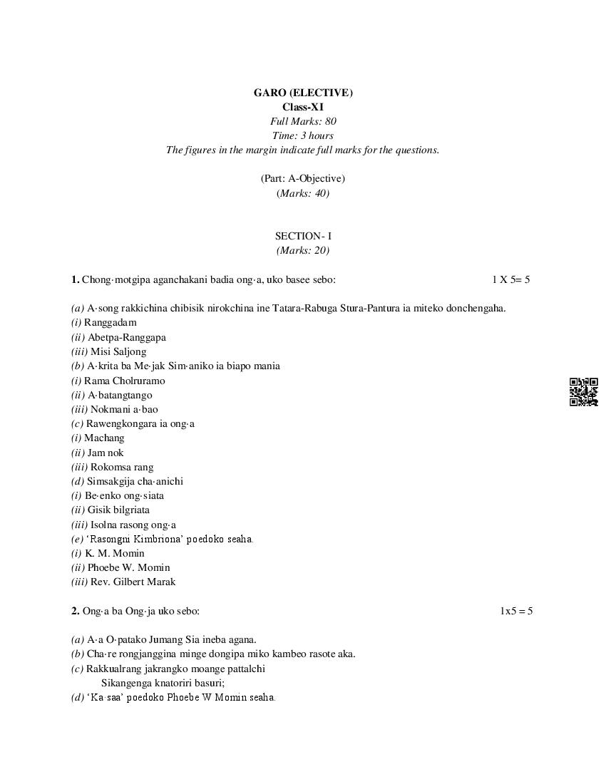 The MBOSE Sample Question Paper 2026 for Class 11 (Class 11) Garo Elective is as follows.
