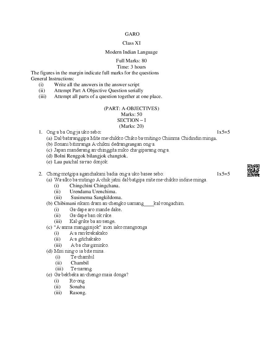 The MBOSE Sample Question Paper 2026 for Class 11 (Class 11) Garo is as follows.