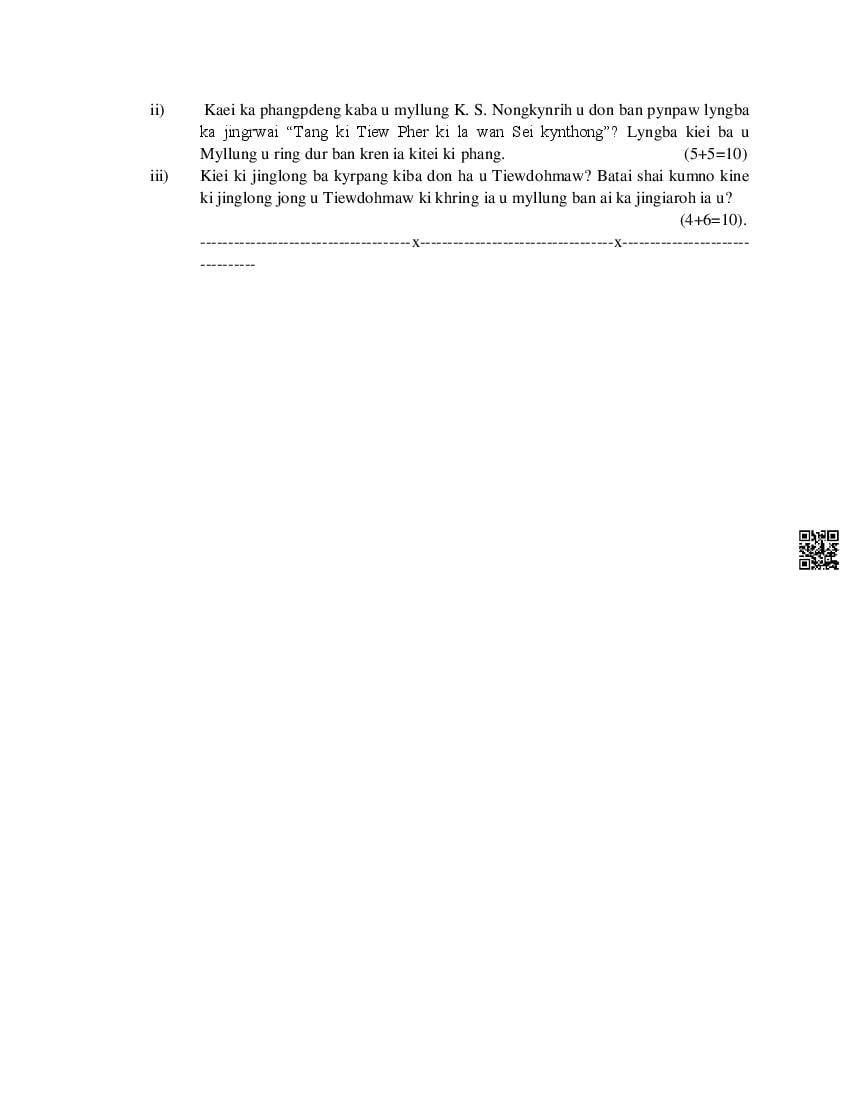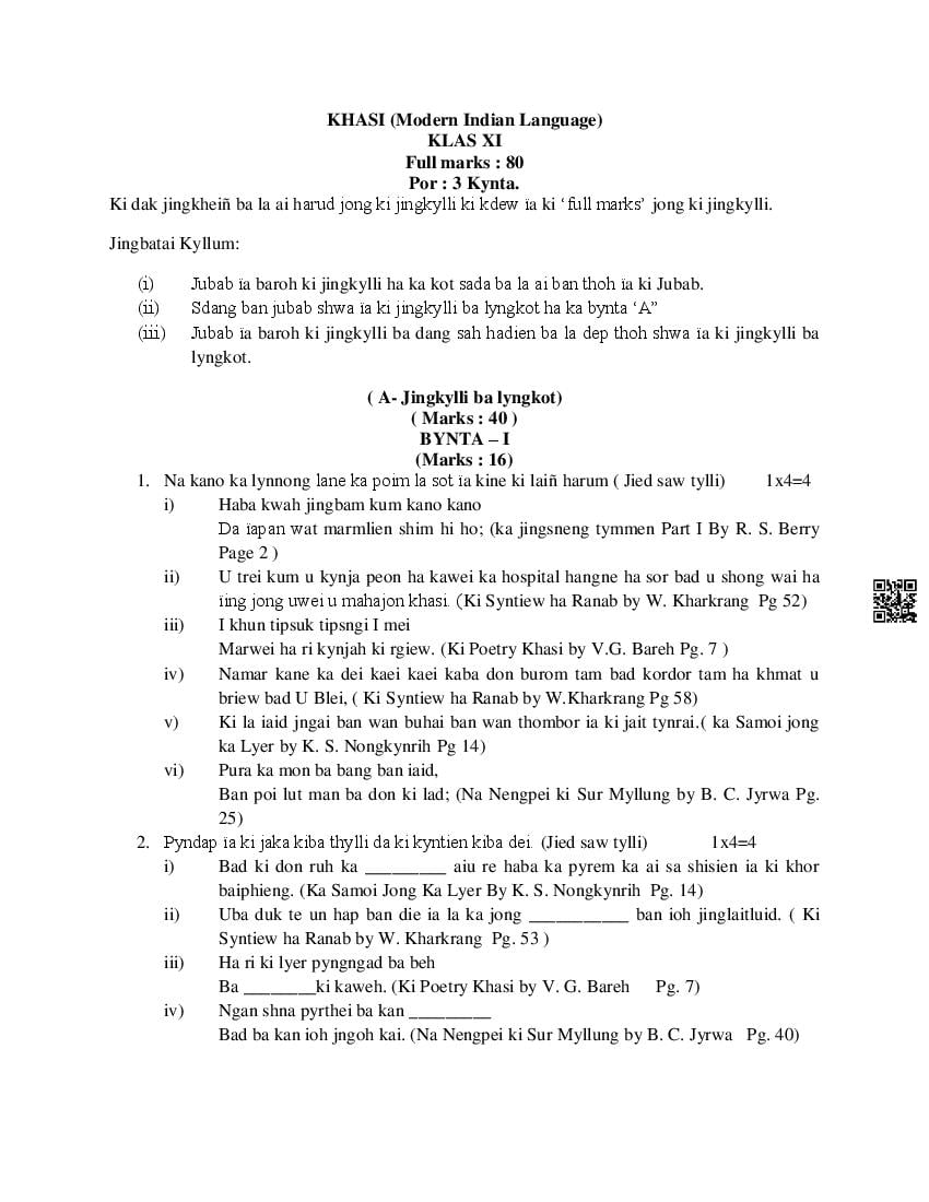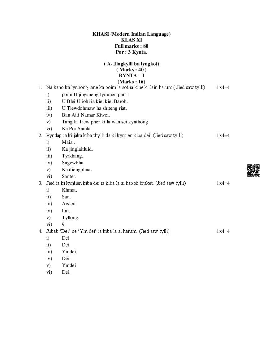 The MBOSE Sample Question Paper 2026 for Class 11 (Class 11) Khasi is as follows.