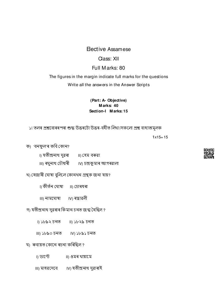 The MBOSE Sample Question Paper 2026 for HSSLC (Class 12) Assamese Elective is as follows.
