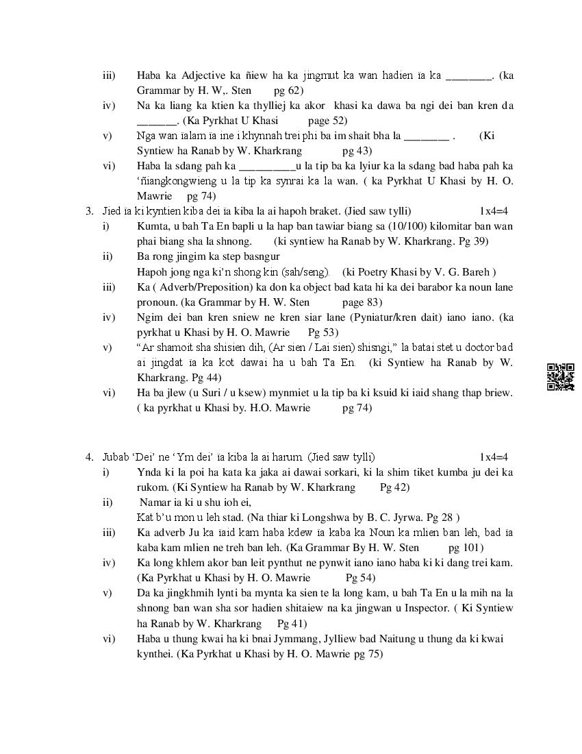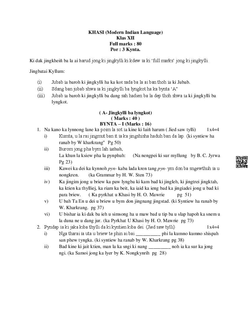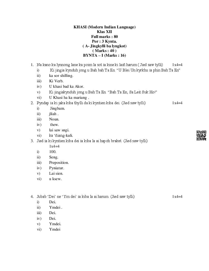 The MBOSE Sample Question Paper 2026 for HSSLC (Class 12) Khasi is as follows.