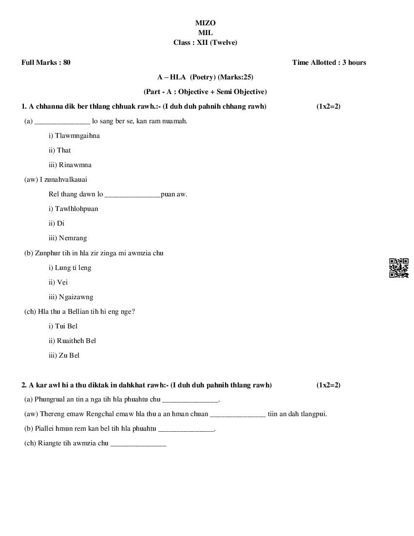 The MBOSE Sample Question Paper 2026 for HSSLC (Class 12) Mizo is as follows.