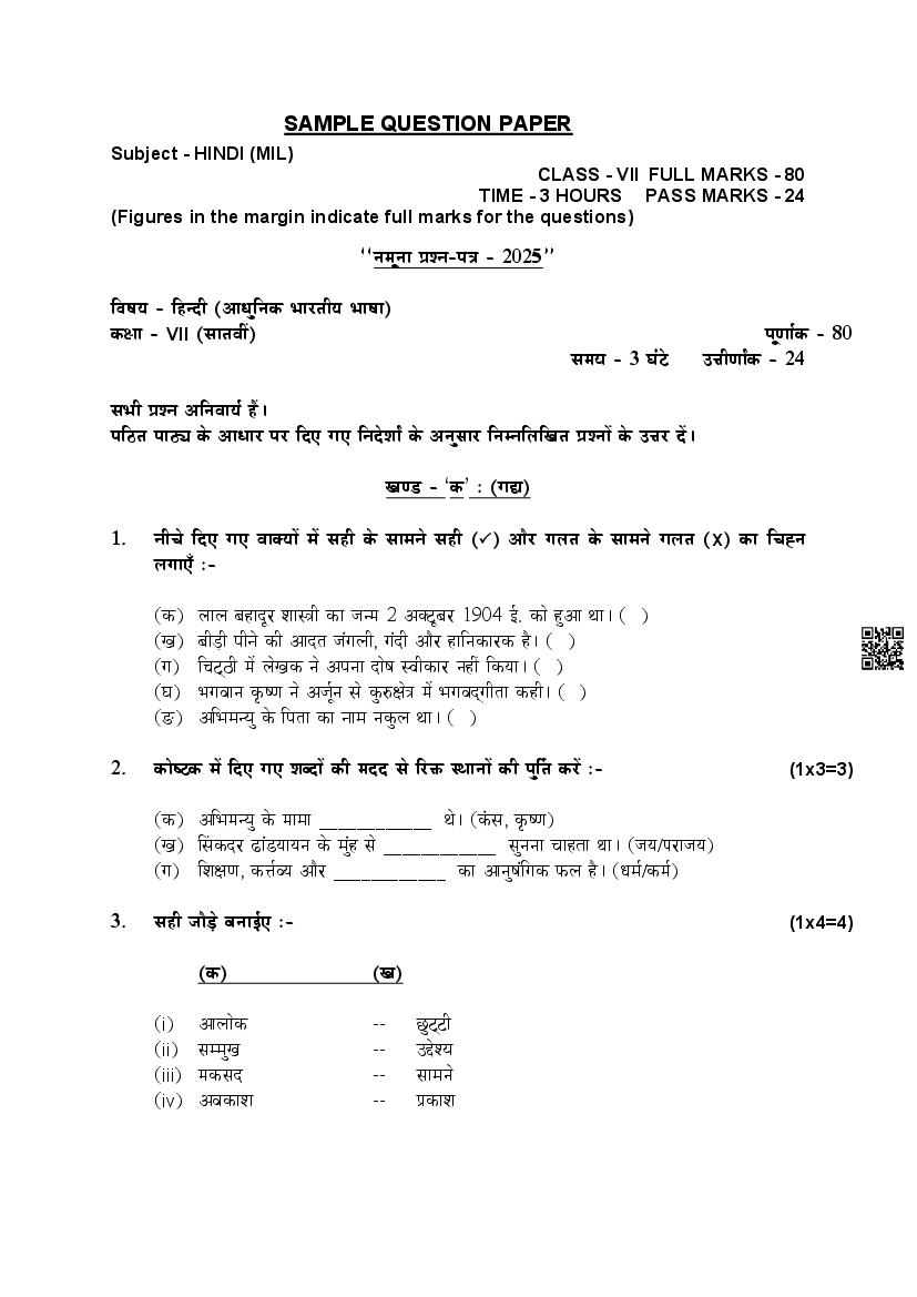 The MBOSE Sample Question Paper 2026 for Class VII (Class 7) Hindi is as follows.