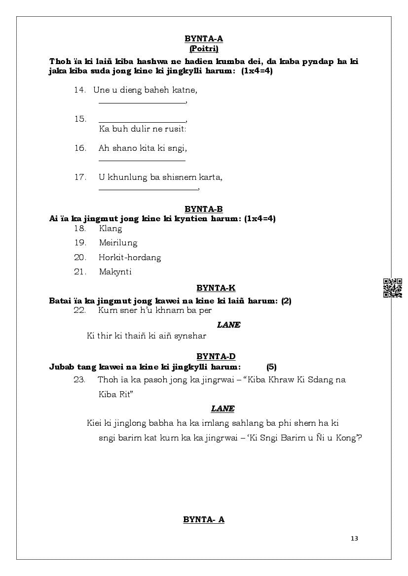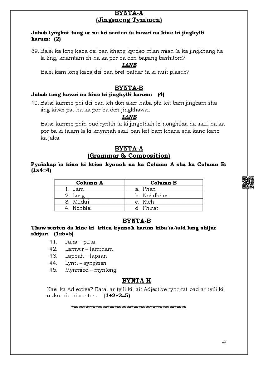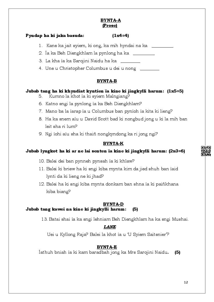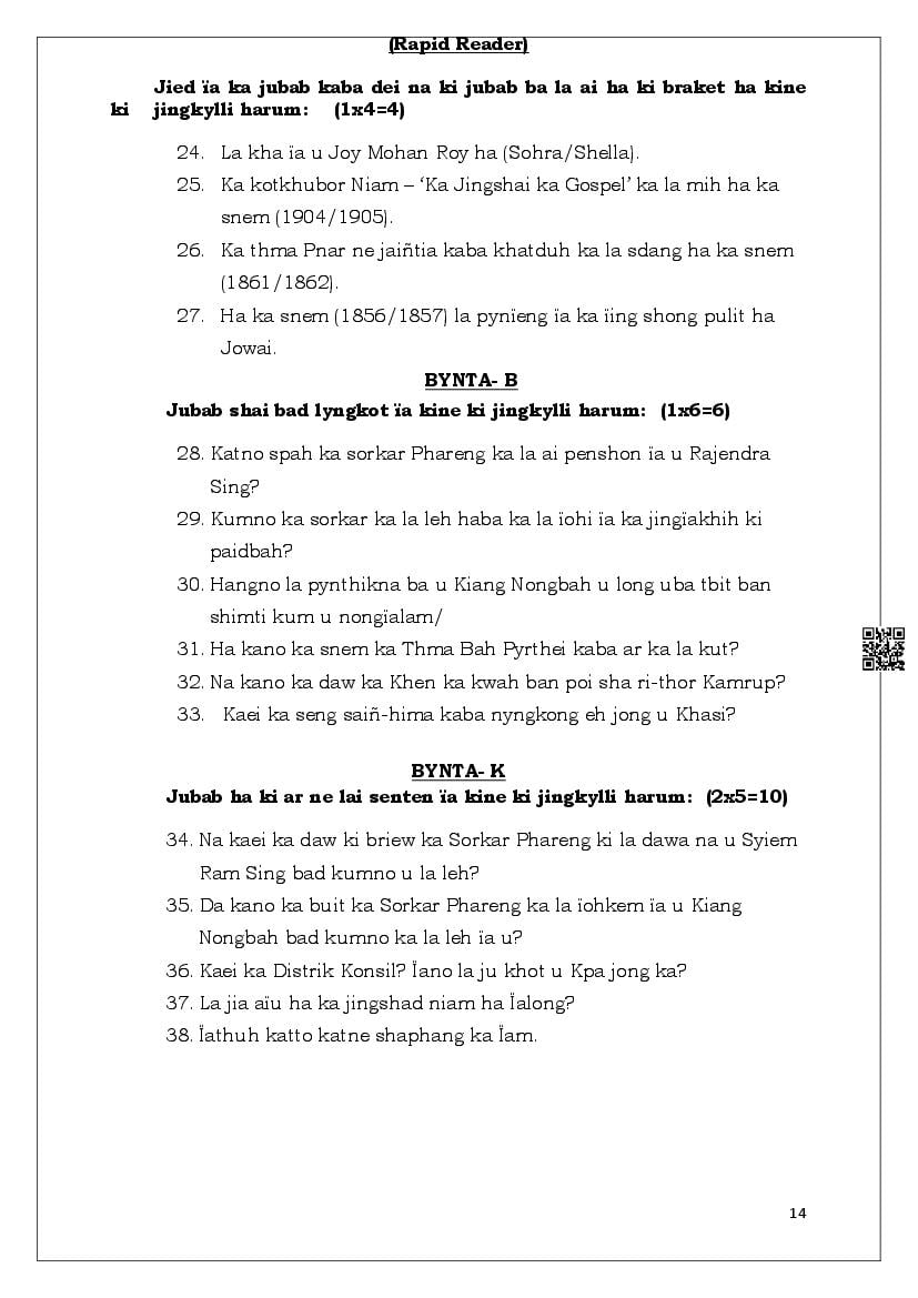 The MBOSE Sample Question Paper 2026 for Class VIII (Class 8) Khasi is as follows.