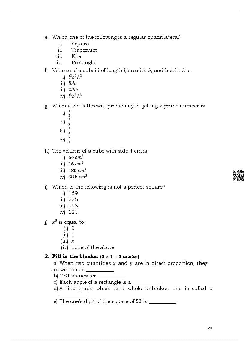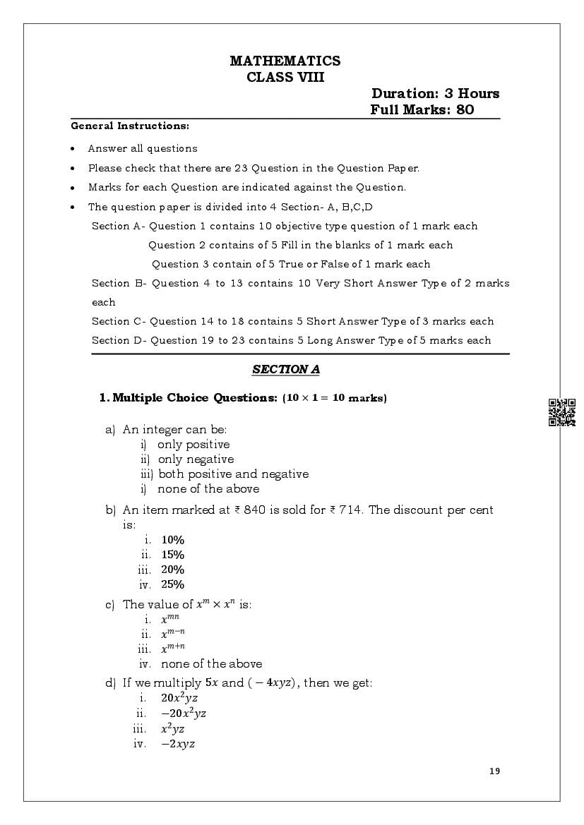 The MBOSE Sample Question Paper 2026 for Class VIII (Class 8) Maths is as follows.