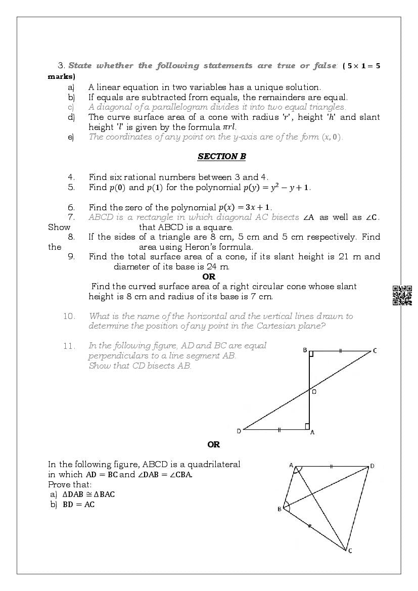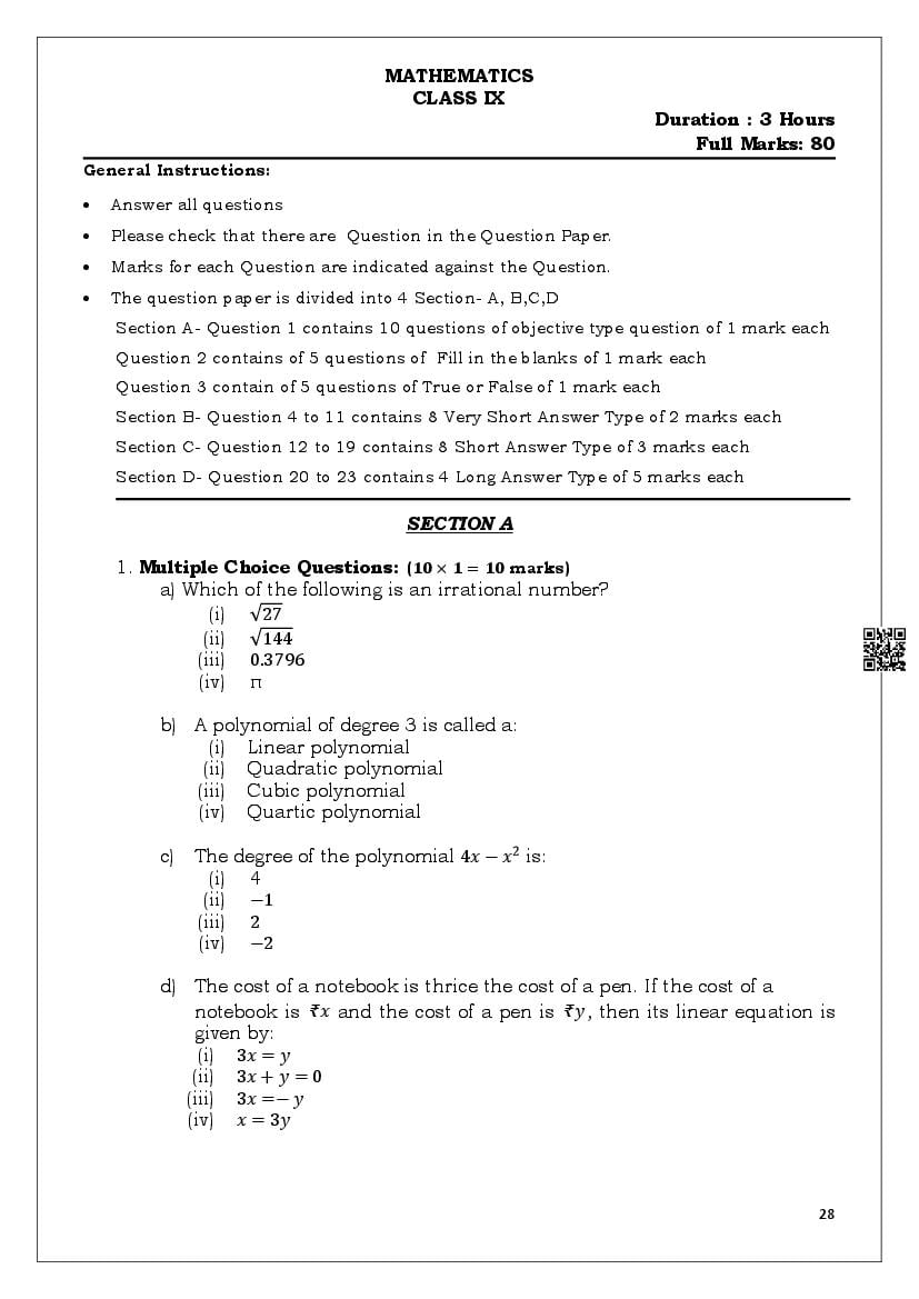 The MBOSE Sample Question Paper 2026 for Class IX (Class 9) Maths is as follows.