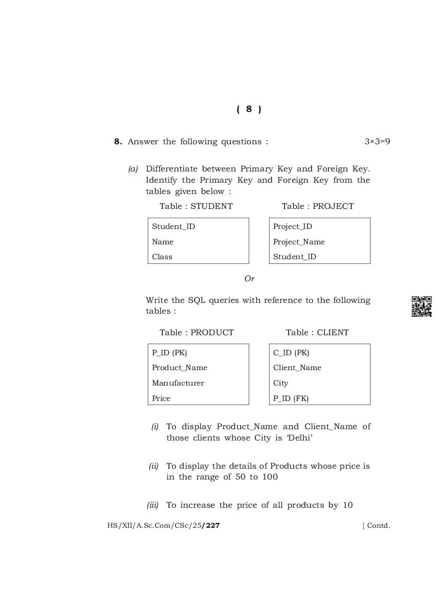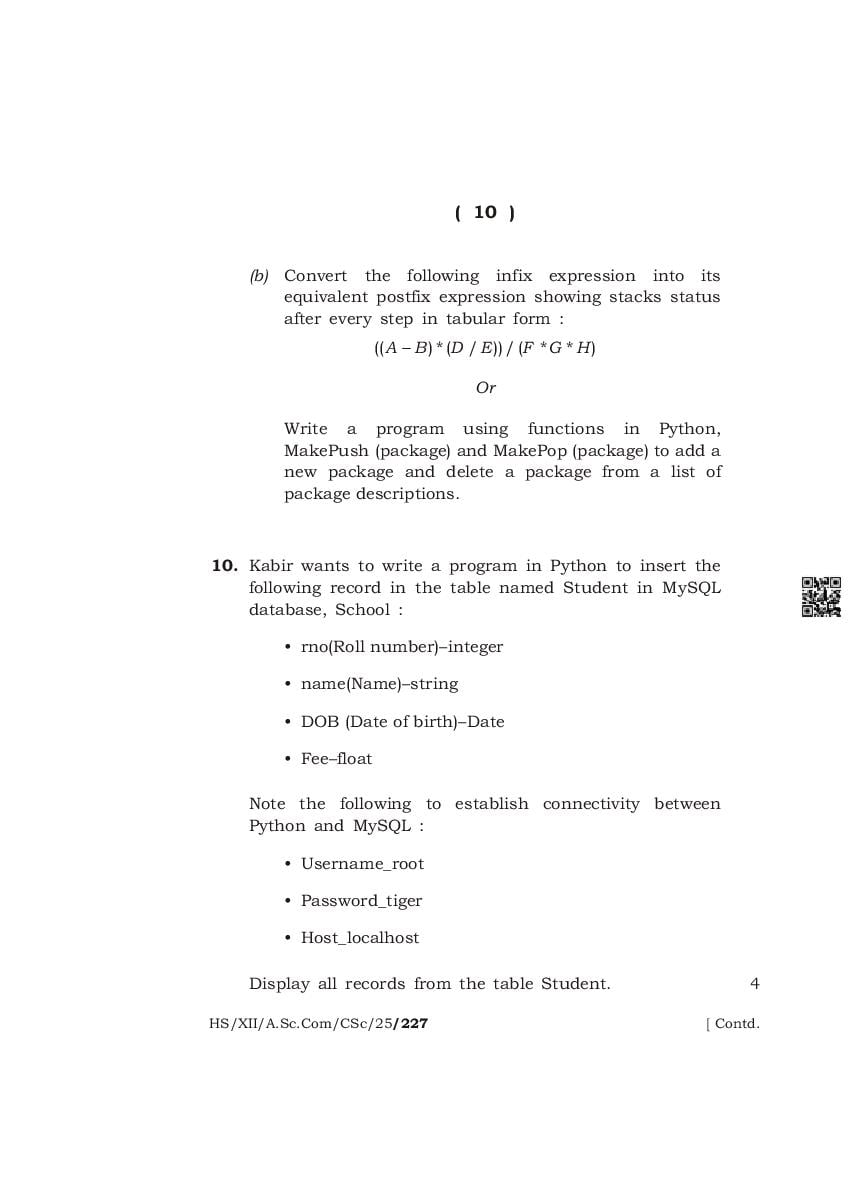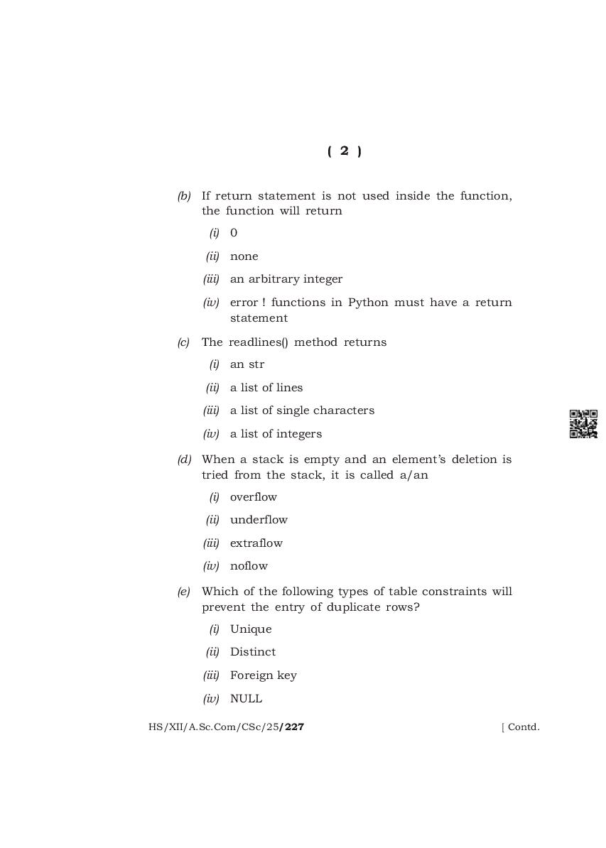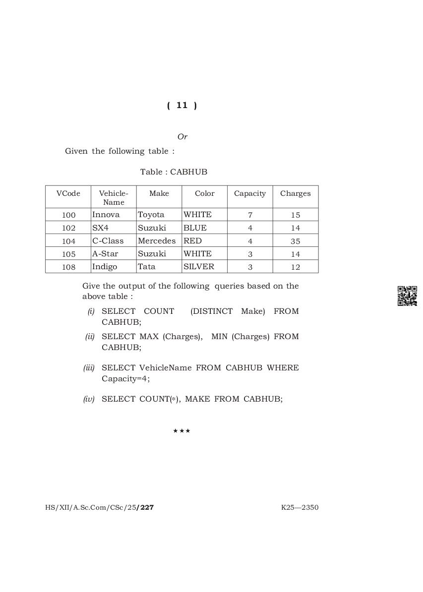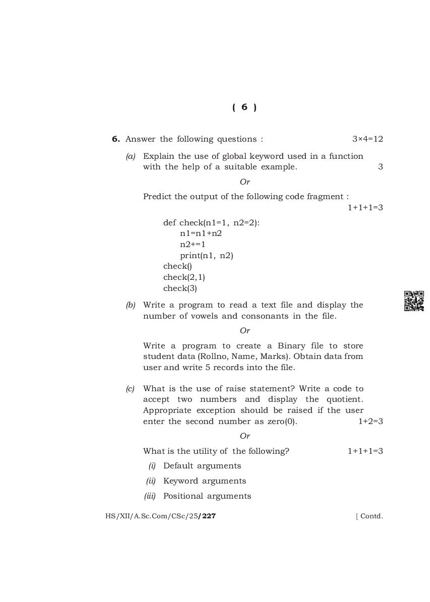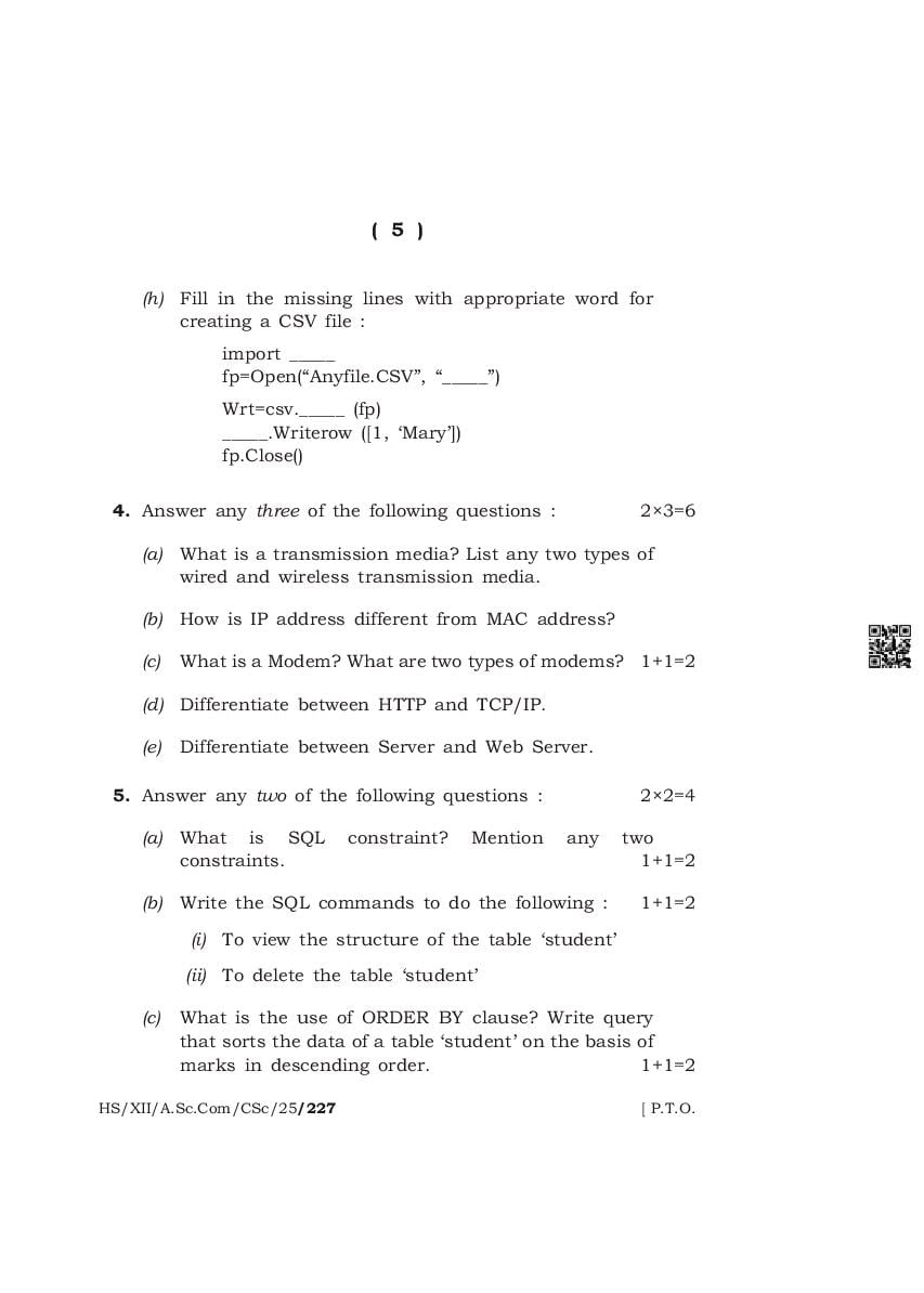 The complete class 12 question paper for Computer Science subject is as follows.