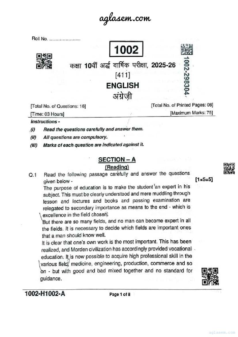MP Board Class 10th English Ardhvaarshik Paper 2025-26