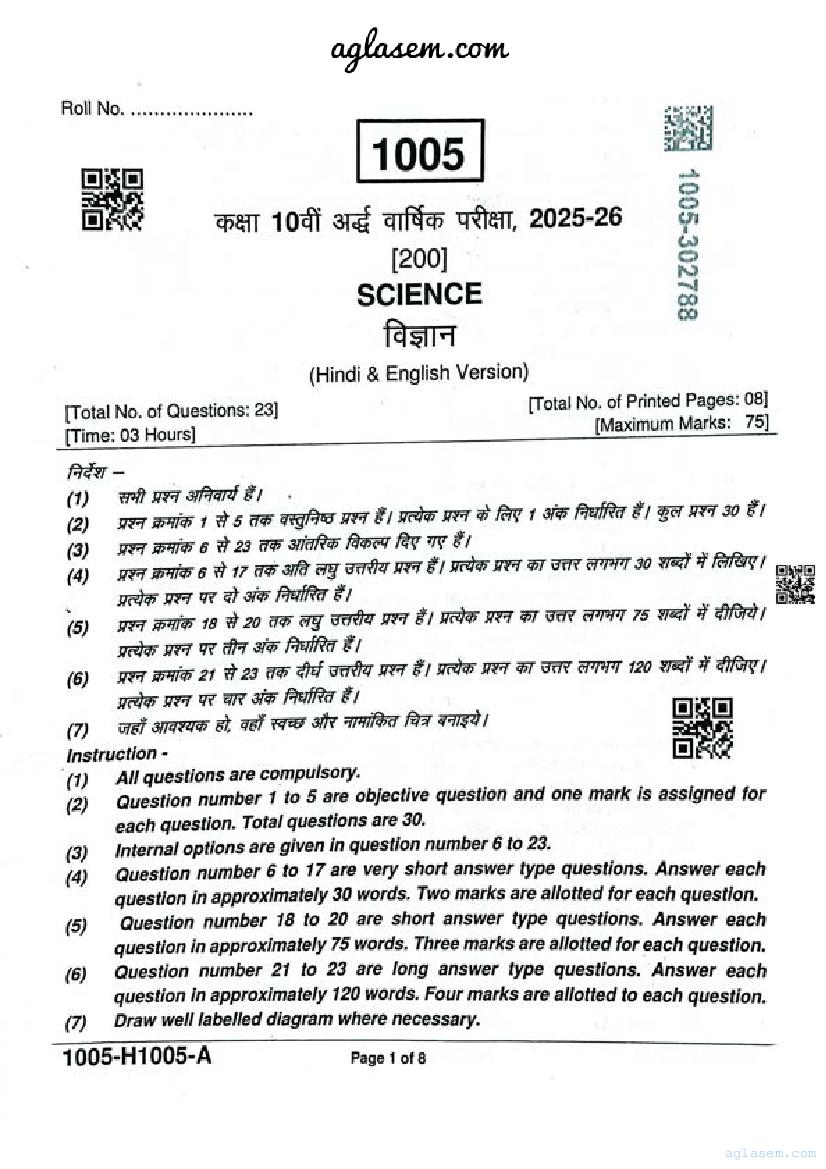 MP Board Class 10th Science Ardhvaarshik Paper 2025-26