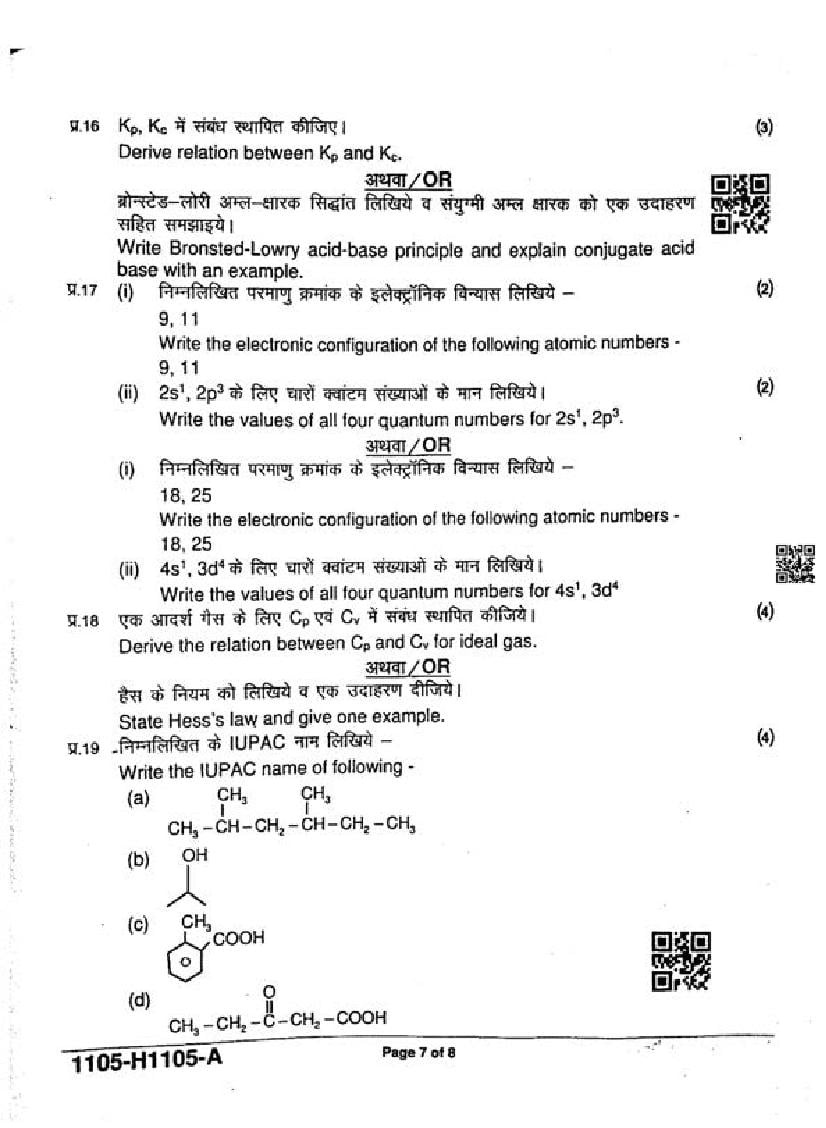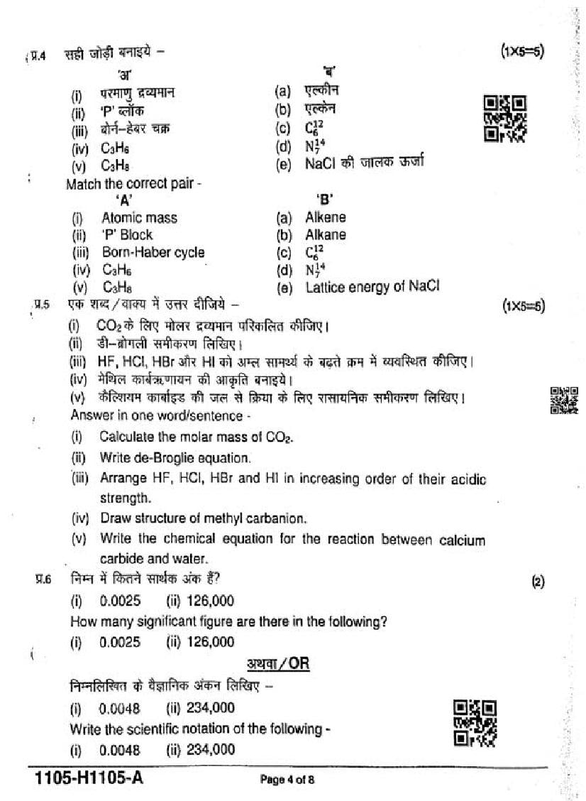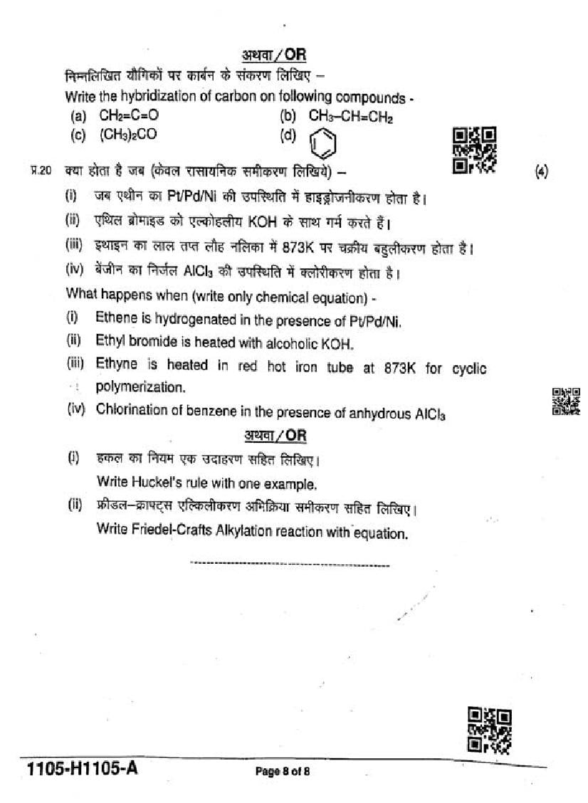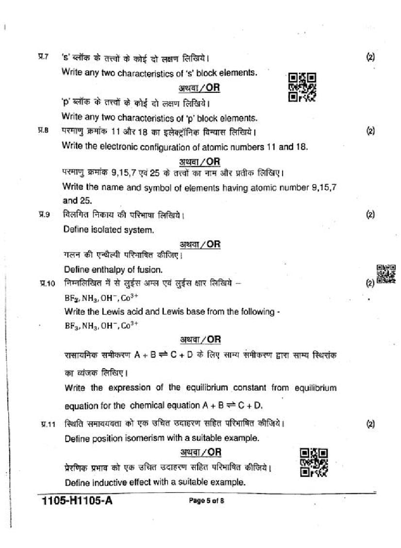 The MP Board Question Paper of class 11 Ardhvaarshik Exam for Chemistry subject is as follows.