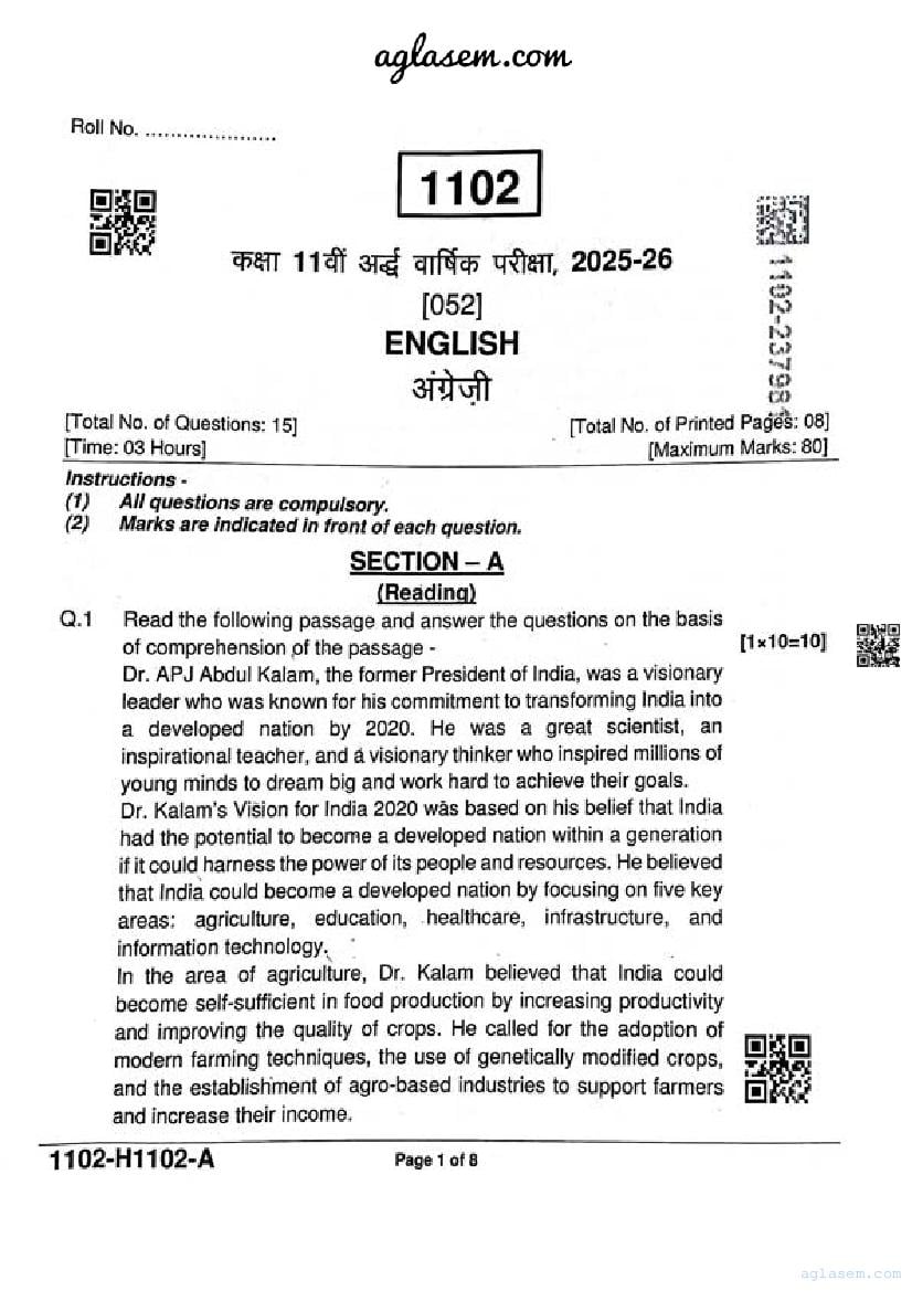 MP Board Class 11th English Ardhvaarshik Paper 2025-26