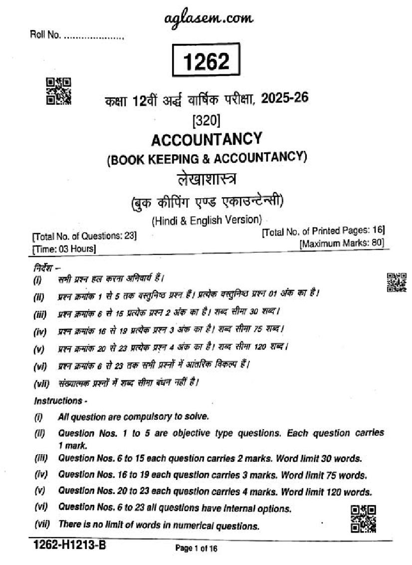 MP Board Class 12 Half Yearly Question Paper 2025-26 Accountancy View Download
